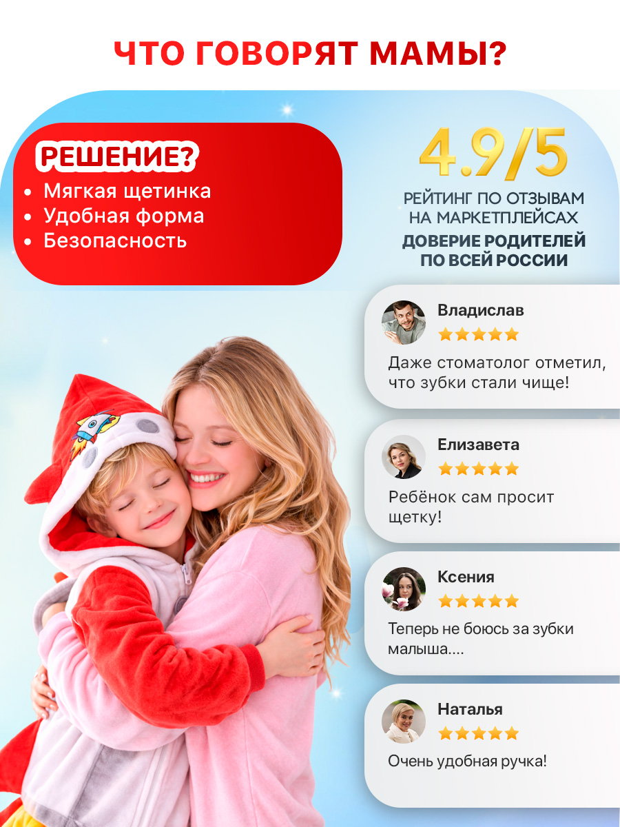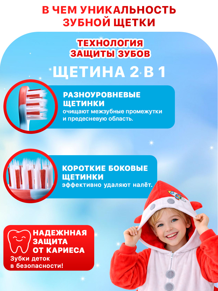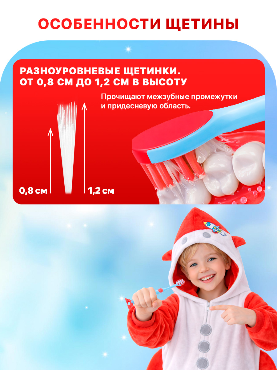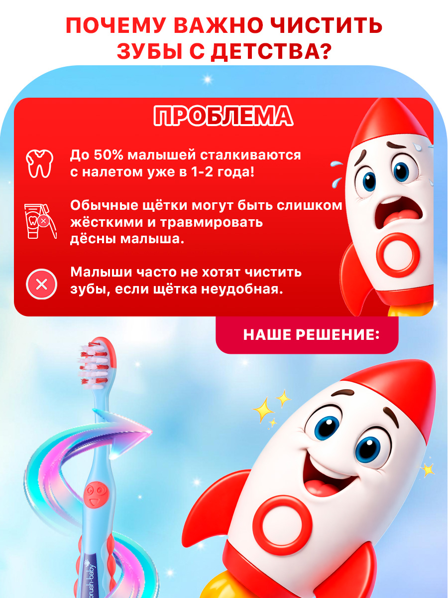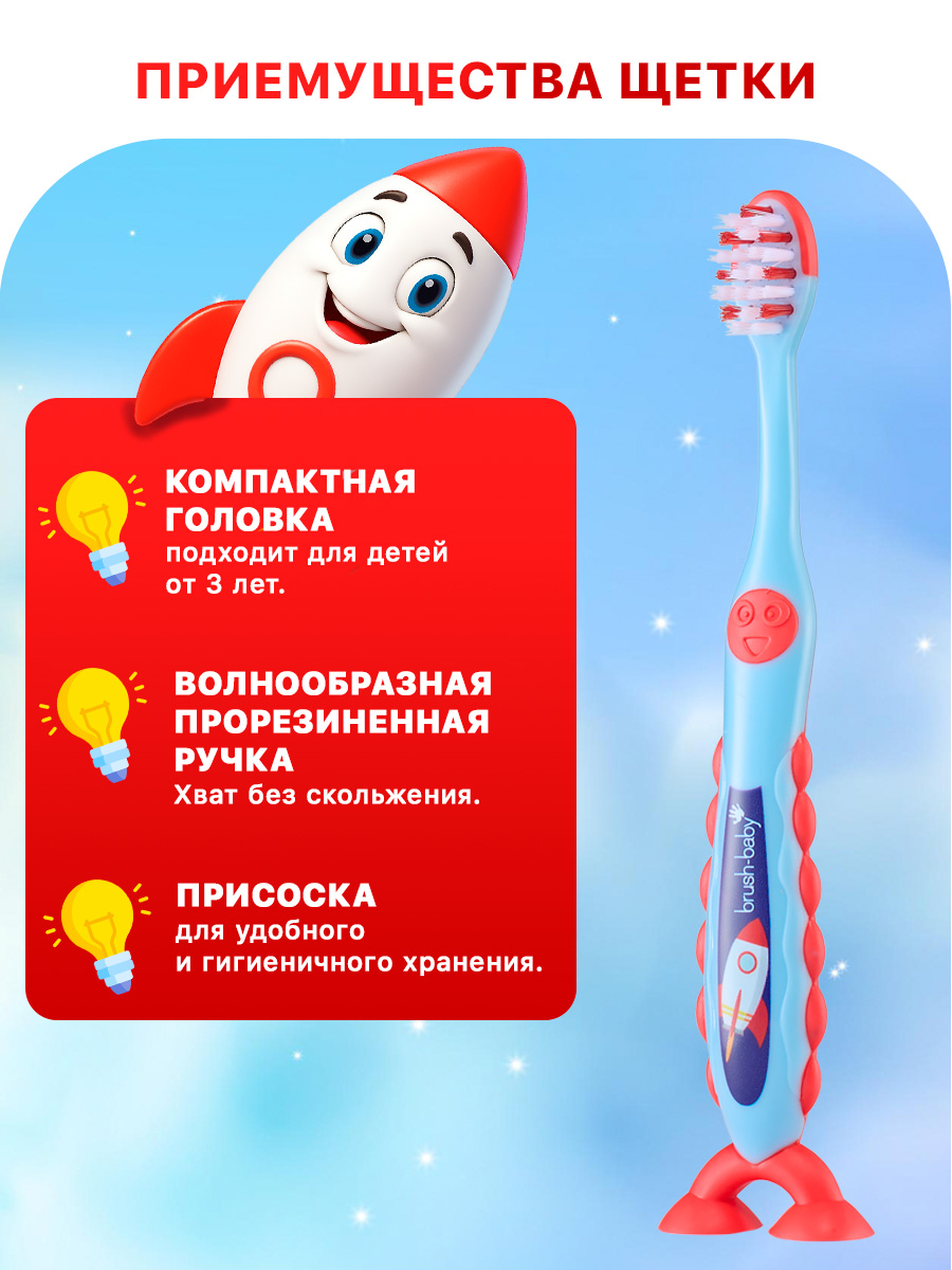 Изделие подходит для чистки зубов с ортодонтическими конструкциями. Щетка Браш-Бэби устойчива за счет ножек-присосок. Прорезиненная ручка удобно лежит в маленькой руке. Весёлый красочный дизайн ракеты не оставит равнодушными вас и вашего малыша.