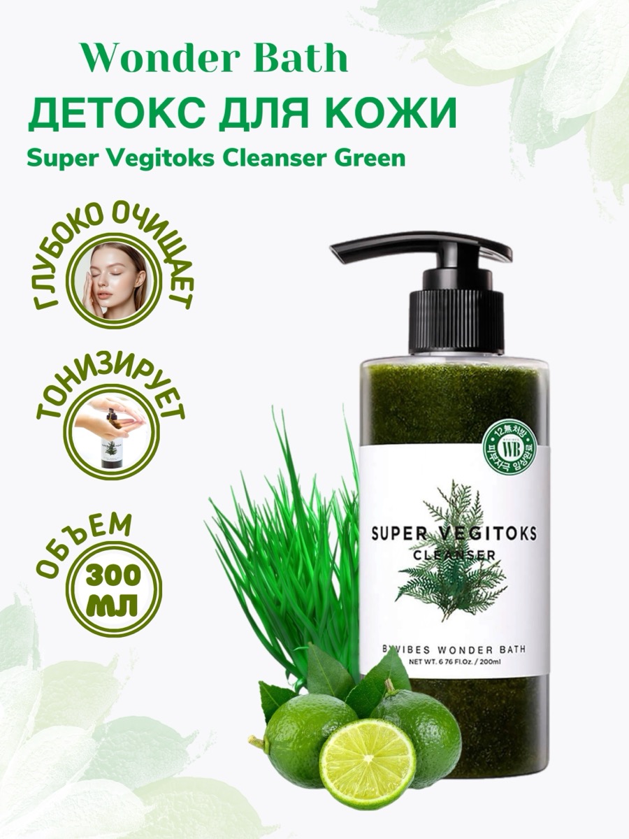 By Wonder Bath Super Vegitoks Cleanser Green — детокс-очищение для лица объёмом 300 мл, которое сочетает очищающий эффект и заботу о коже. Это средство не просто устраняет макияж и загрязнения, но и интенсивно выводит токсины из пор, нормализует выработку себума и сохраняет баланс влаги. В формуле собраны активные компоненты, которые работают синергично для глубокого и мягкого очищения.