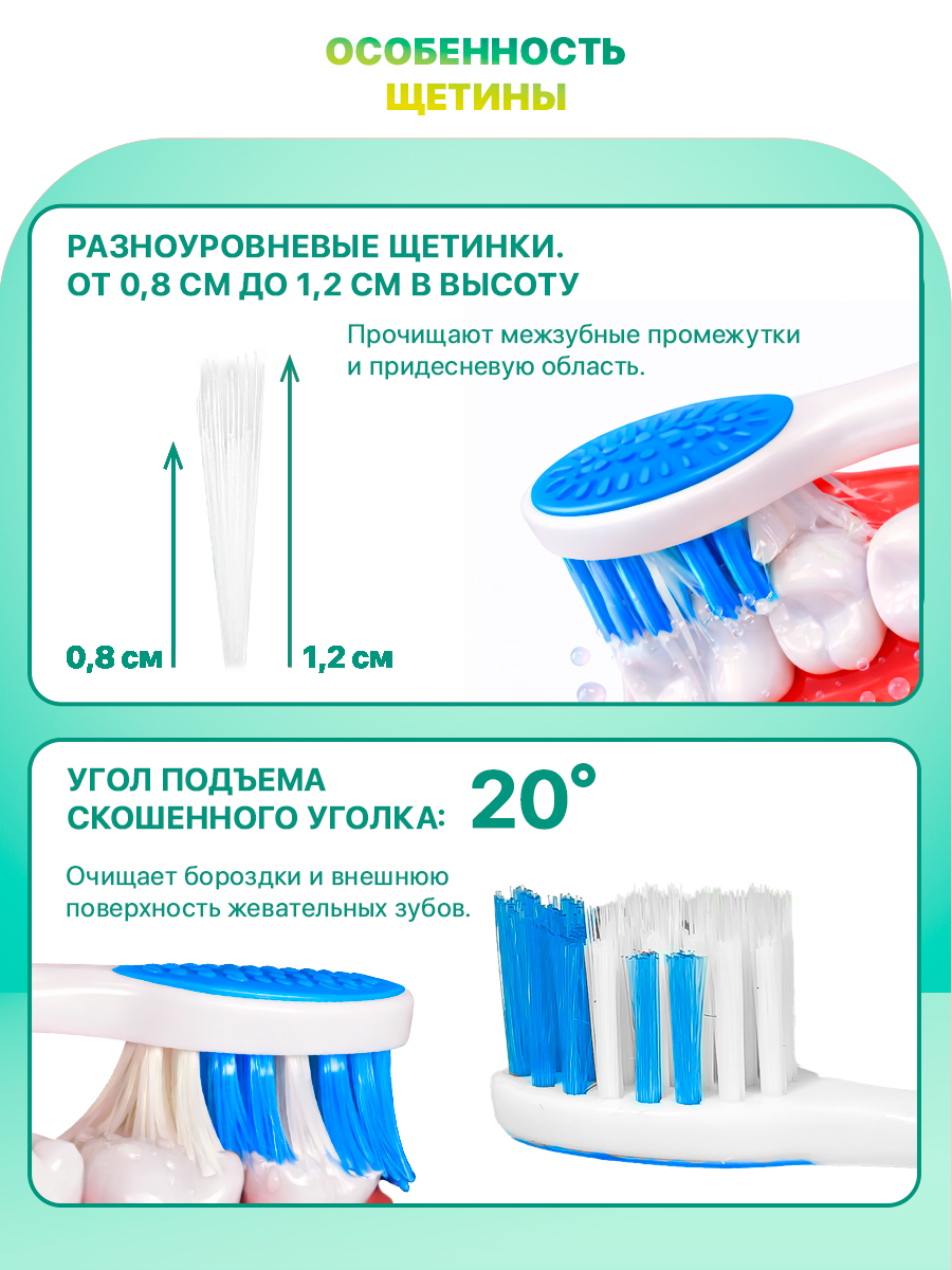 Щетка позволяет достичь далеко расположенных жевательных зубов, а также эффективно удалять налет с эмали и придесневой области.