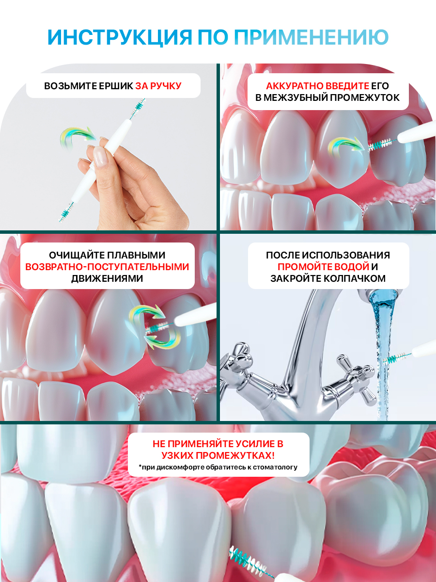 - Не вводите ершик с усилием в узкие промежутки.