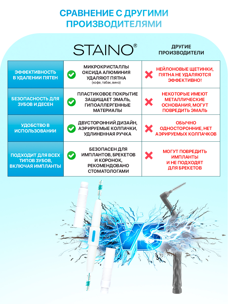- Эффективность: Инновационные щетинки STAINO® с микрокристаллами мягко и безопасно удаляют пятна от кофе, табака и налет уже с первого применения.