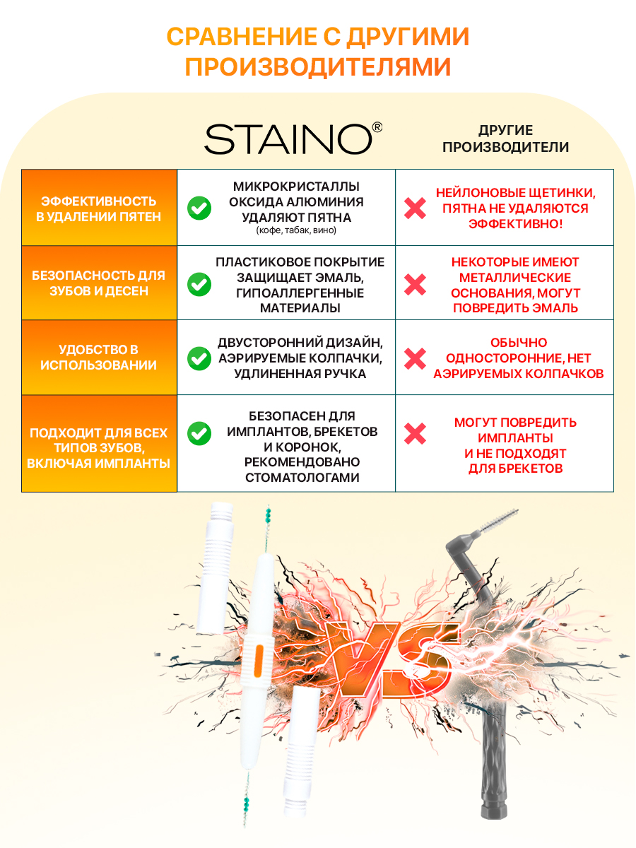 - Технология STAINO®: микрокристаллы оксида алюминия эффективно удаляют налет и пятна.