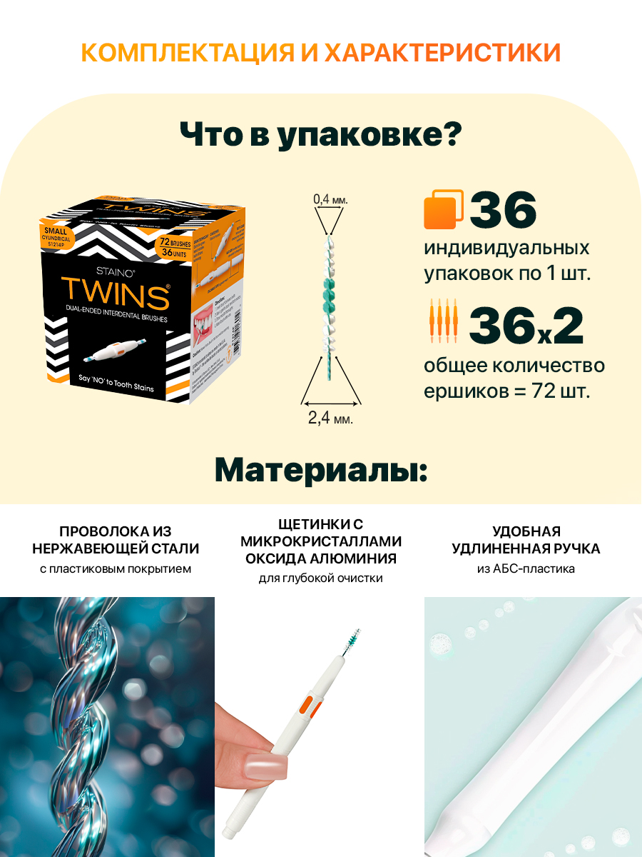 STAINO TWINS Small Cylindrical межзубные двусторонние ершики, упаковка 36 шт., размер 0,4 мм, S1214P