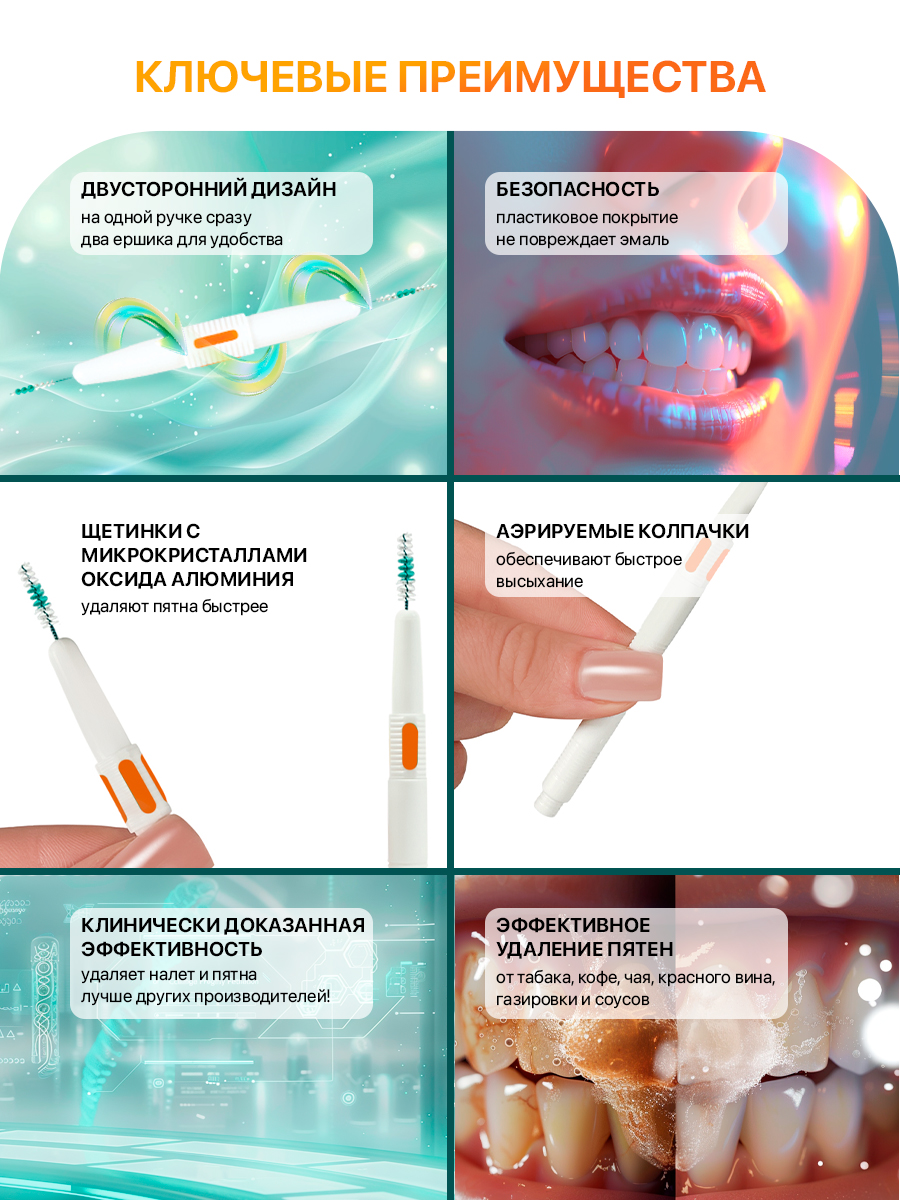 - Глубокая очистка: эффективно устраняют налет и пигмент от табака, кофе и чая.