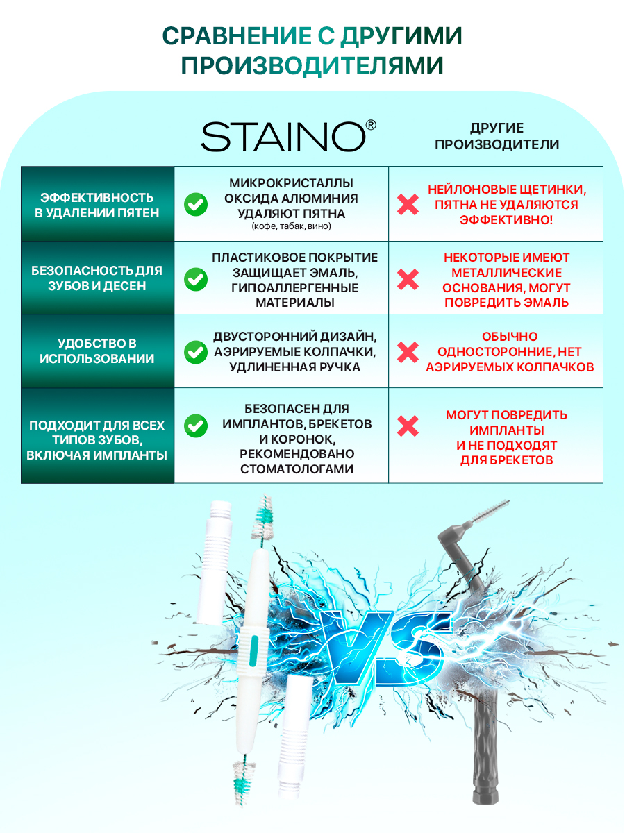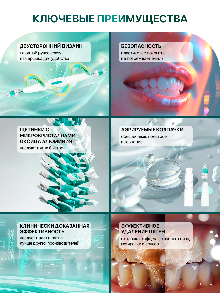 - Эффективное очищение: Щетинки с микрокристаллами оксида алюминия удаляют налет и пятна от табака, кофе и чая.