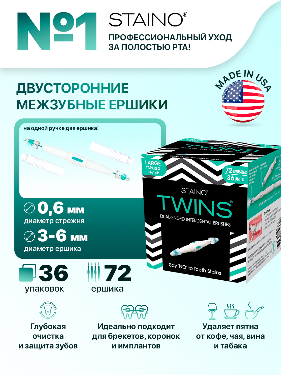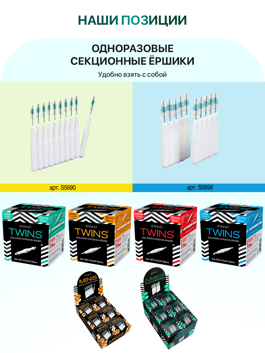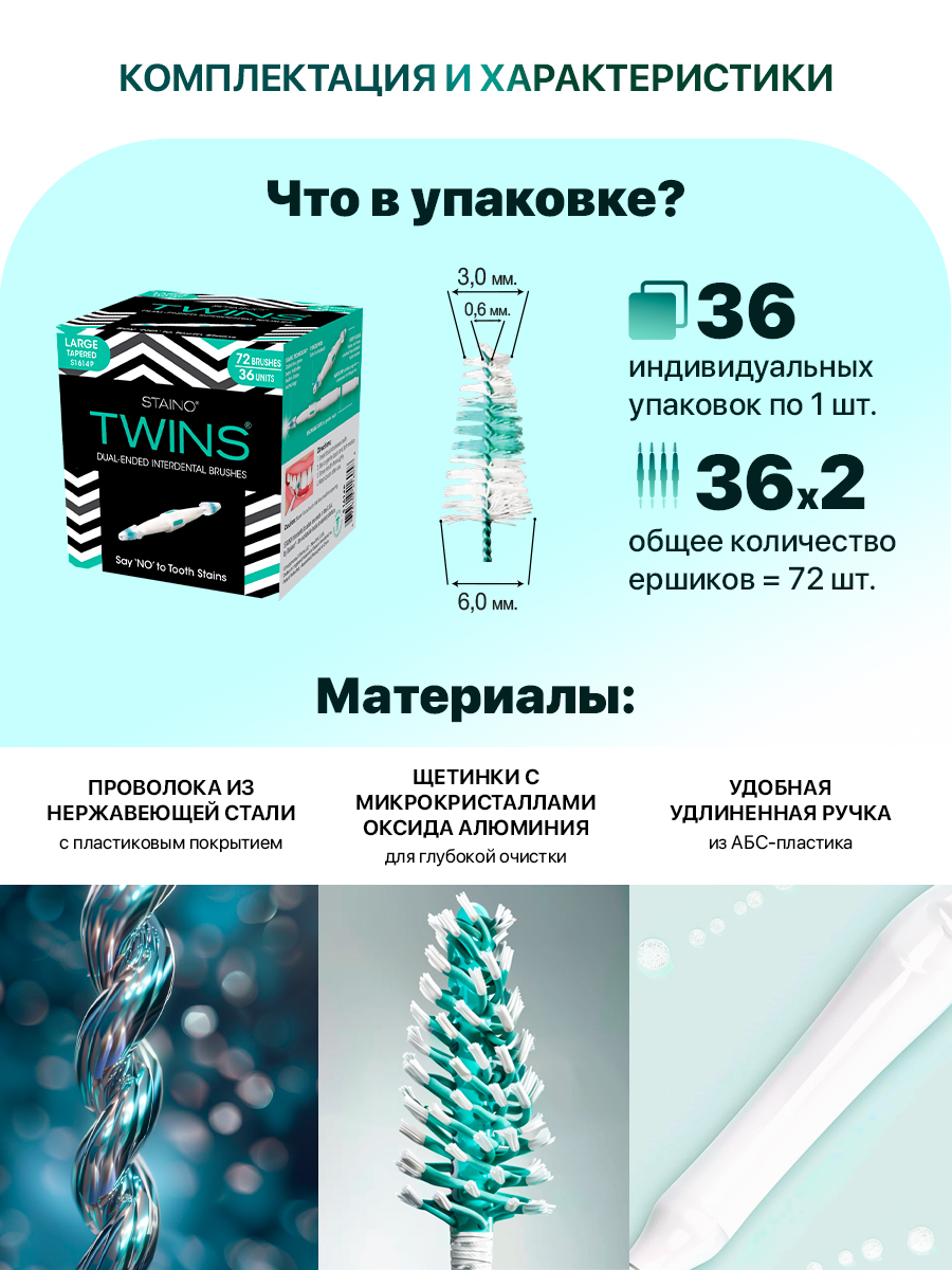 TWINS® от STAINO – это двусторонние конические межзубные ершики, разработанные для тщательного ухода за полостью рта. Они обеспечивают эффективное удаление налета и пятен, а также способствуют профилактике заболеваний десен.
