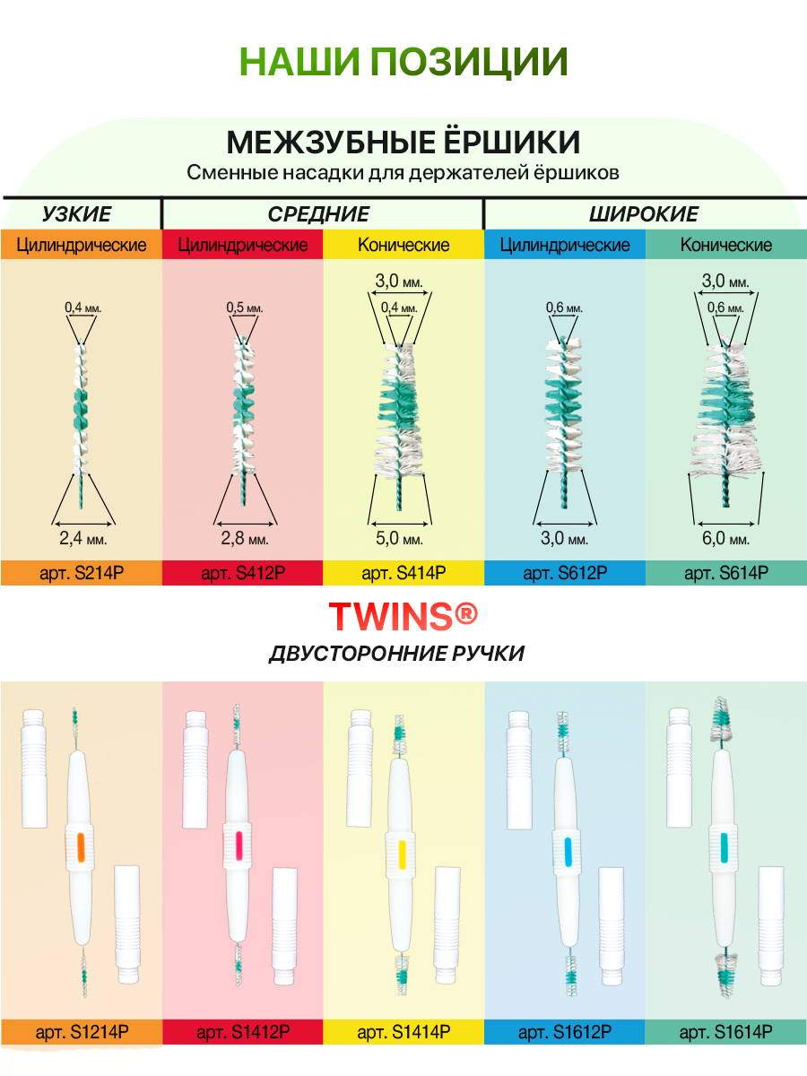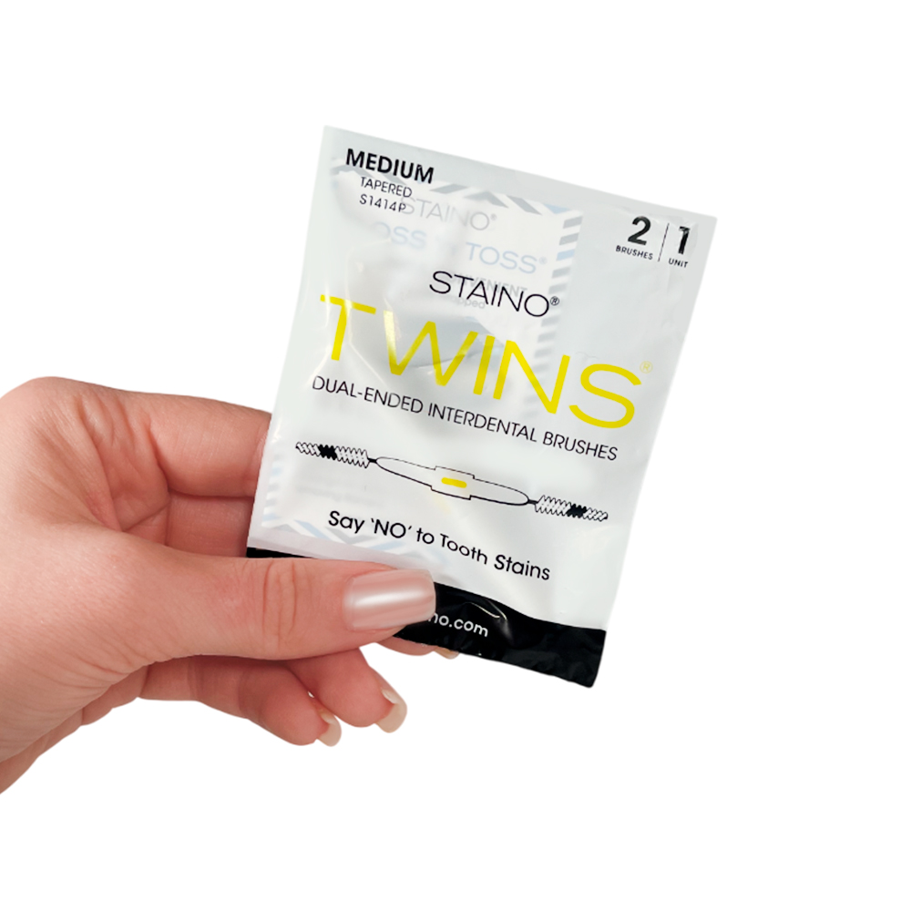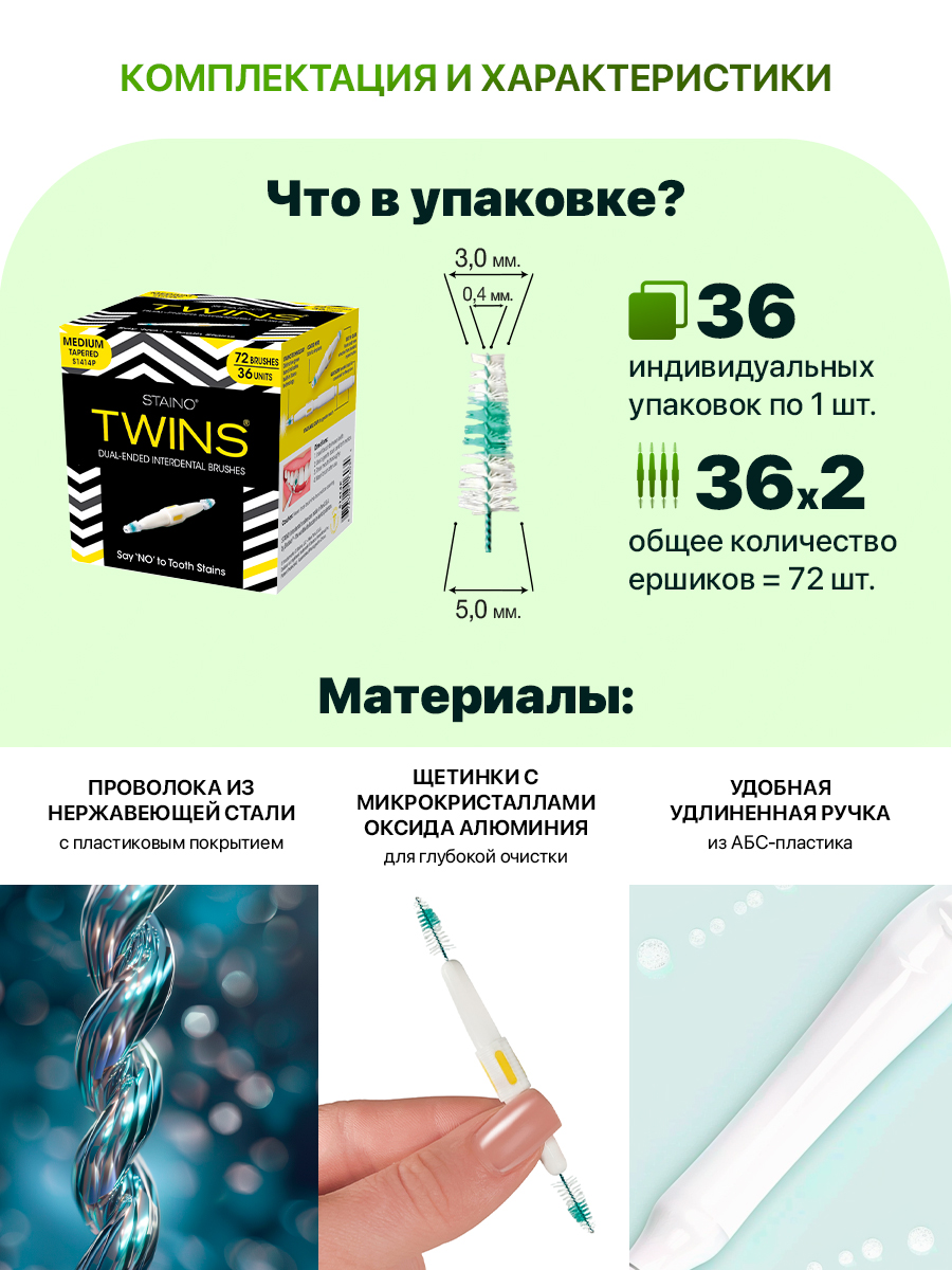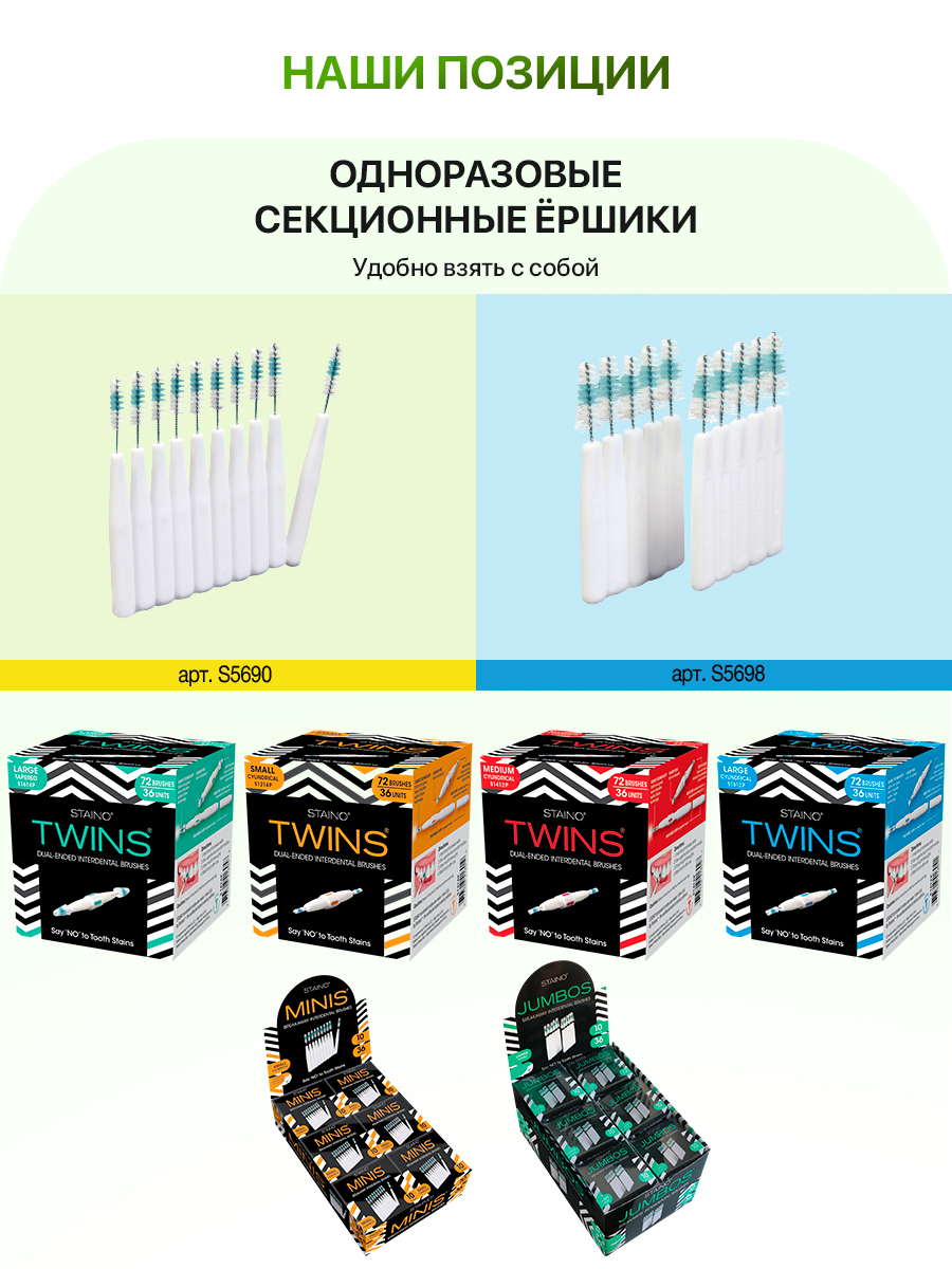TWINS® от STAINO – двусторонние межзубные ершики, обеспечивающие качественную очистку и здоровье полости рта. Подходят для людей с брекетами, коронками и имплантами.