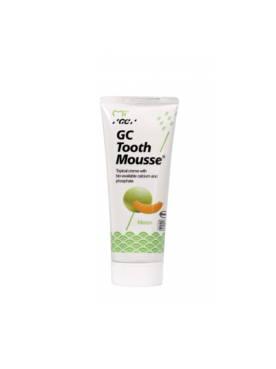 Всем известно, что для здоровья зубов необходим кальций. Но лишь немногие знают, что эмаль зубов не способна усваивать кальций в обычном виде. Поэтому необходимо применять сложные соединения кальция для эффективной реминерализации эмали зубов. Гель GC Tooth Mousse производится в Японии уже более десяти лет. Секрет высокой эффективности Туф Мусс дыня кроется в запатентованной формуле Recaldent® (Казеин Фосфопептид - Аморфный Кальций Фосфат). Данное соединение вступает в контакт со слюной и естественным гидроксиапатитом, доставляя биодоступный кальций в эмаль зубов. Благодаря этому снижается сверхчувствительность эмали. Благодаря кальцию, происходит реминерализация эмали, что приводит к значительному снижению риска возникновения кариеса. Компоненты Tooth Mousse также активно защищают эмаль зубов от кислот, производимых бактериями. Гели Тусс Мус обладают приятным сладким вкусом, благодаря чему нормализуется слюноотделение, что способствует повышению эффективности лечения. Рем-гель GC Tooth Mousse дыня может применяться детьми с 0 лет.