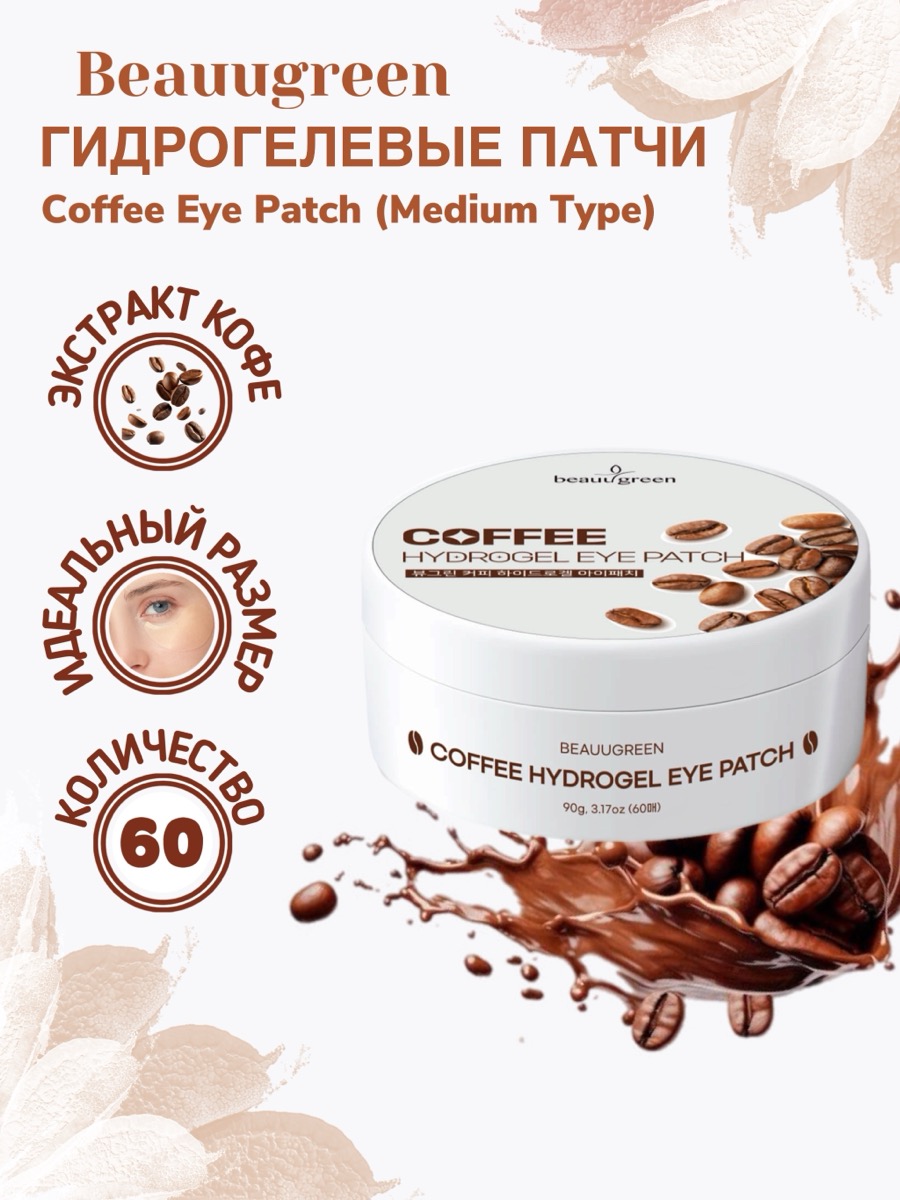 Гидрогелевые патчи Beauugreen Coffee Eye Patch (Medium Type) — это эффективное средство для ухода за кожей вокруг глаз. В составе содержится экстракт кофе, известный своими тонизирующими и дренажными свойствами. Продукт направлен на уменьшение отёков, осветление тёмных кругов и восстановление упругости кожи. Кофеин стимулирует микроциркуляцию, помогает выводить лишнюю жидкость и способствует свежему, отдохнувшему виду даже при недостатке сна.
