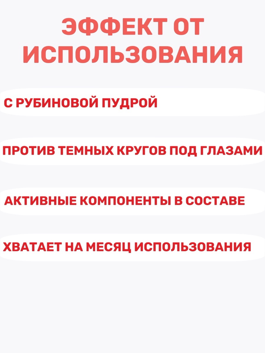 В составе нет агрессивных компонентов, поэтому патчи подходят для чувствительной кожи. Экстракт граната насыщает кожу витаминами, способствует её восстановлению и улучшает цвет. Рубиновая пудра усиливает действие других компонентов, стимулирует обменные процессы и способствует усилению защитных функций кожи. Успокаивающее действие обеспечивает комфорт даже при длительном использовании.