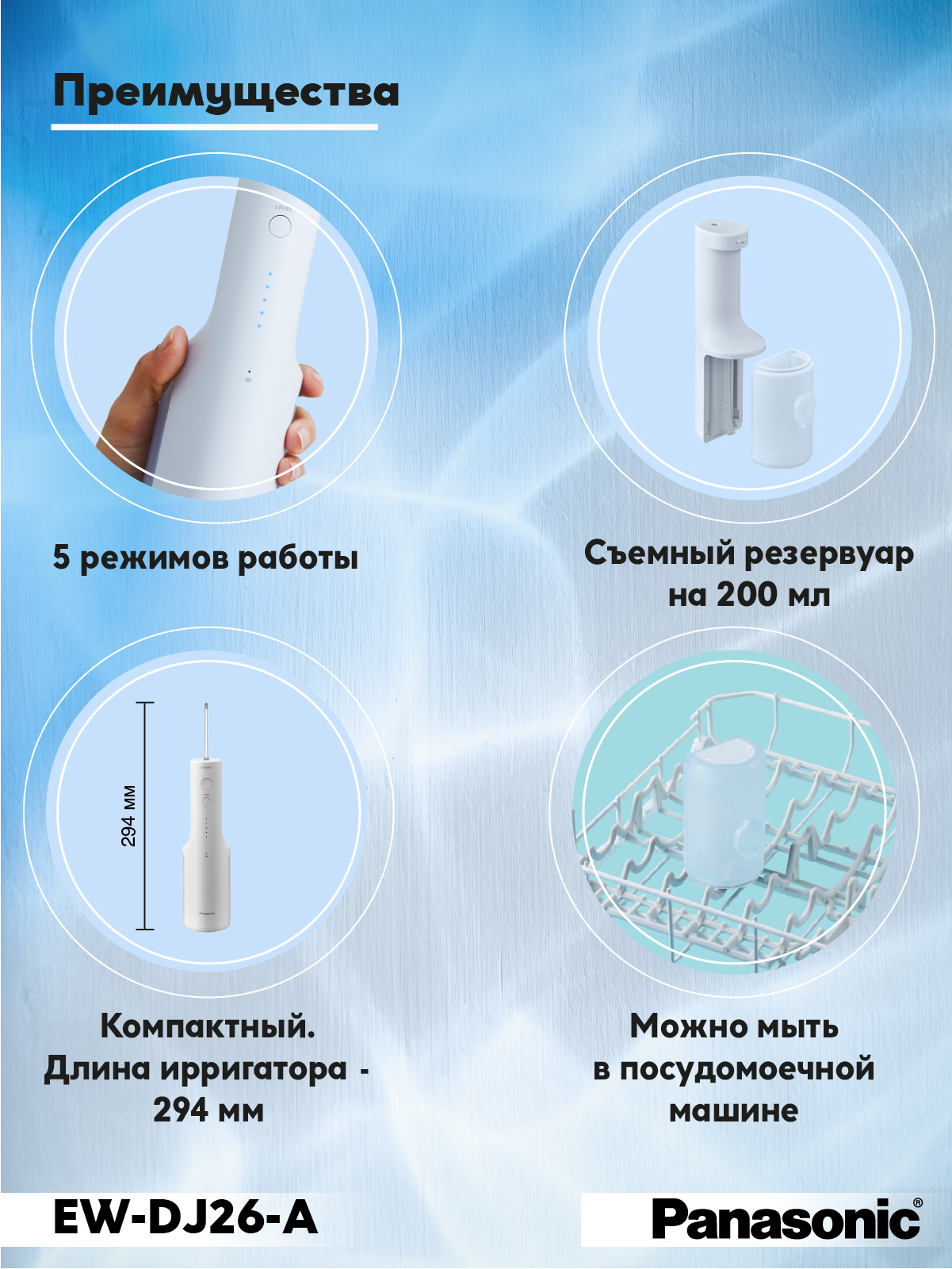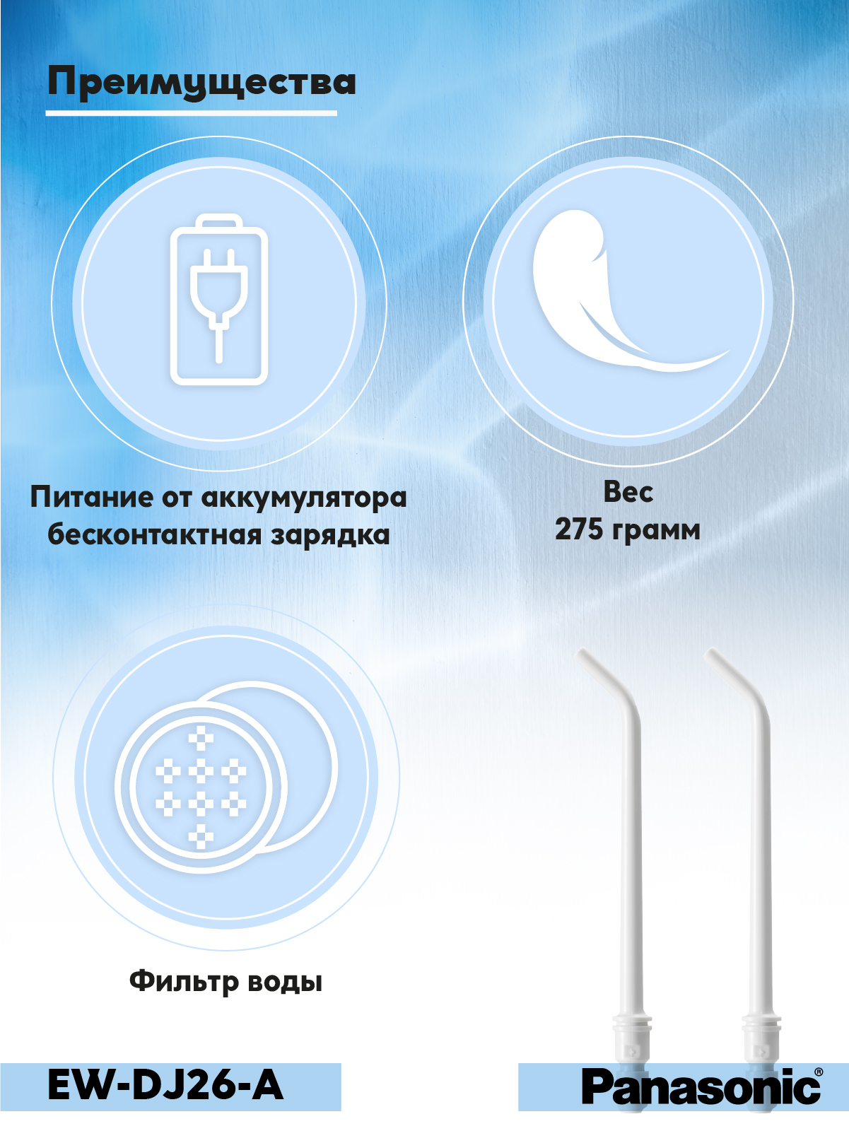 Идеальная чистота зубов в любом месте и в любое время. Портативный ирригатор Panasonic EW-DJ26 — это сочетание японской технологичности и невероятной компактности. Благодаря телескопическому корпусу он легко помещается в ладонь, обеспечивая при этом мощность стационарного прибора. Это незаменимый девайс для тех, кто ценит профессиональную гигиену дома, в путешествиях или в офисе после обеда.