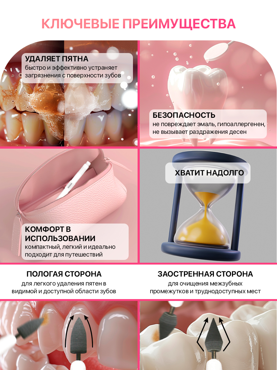- Профессиональное качество: Изготовлен из материала, который стоматологи используют для профессиональной гигиены зубов.