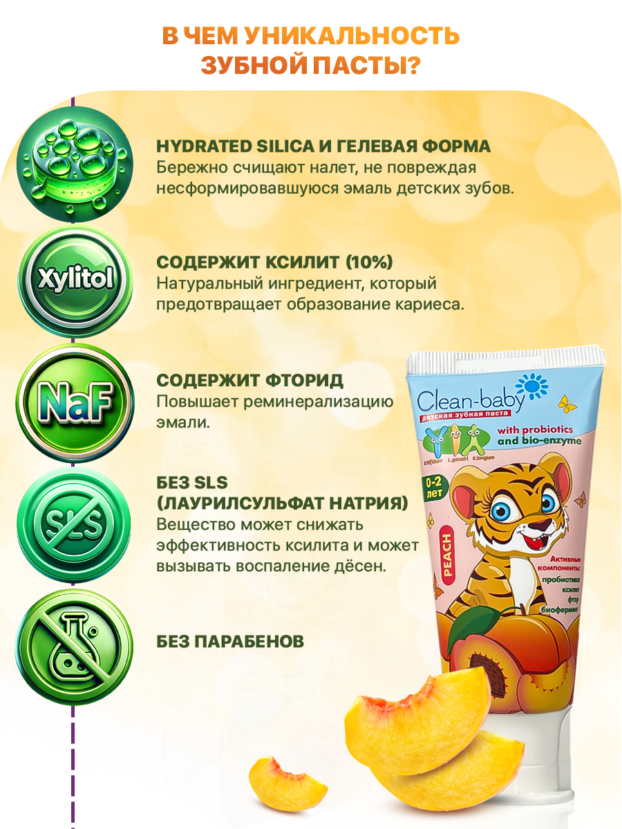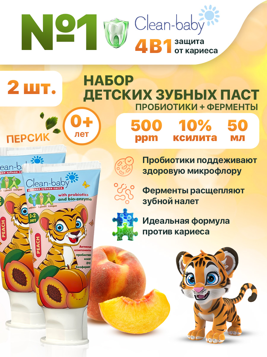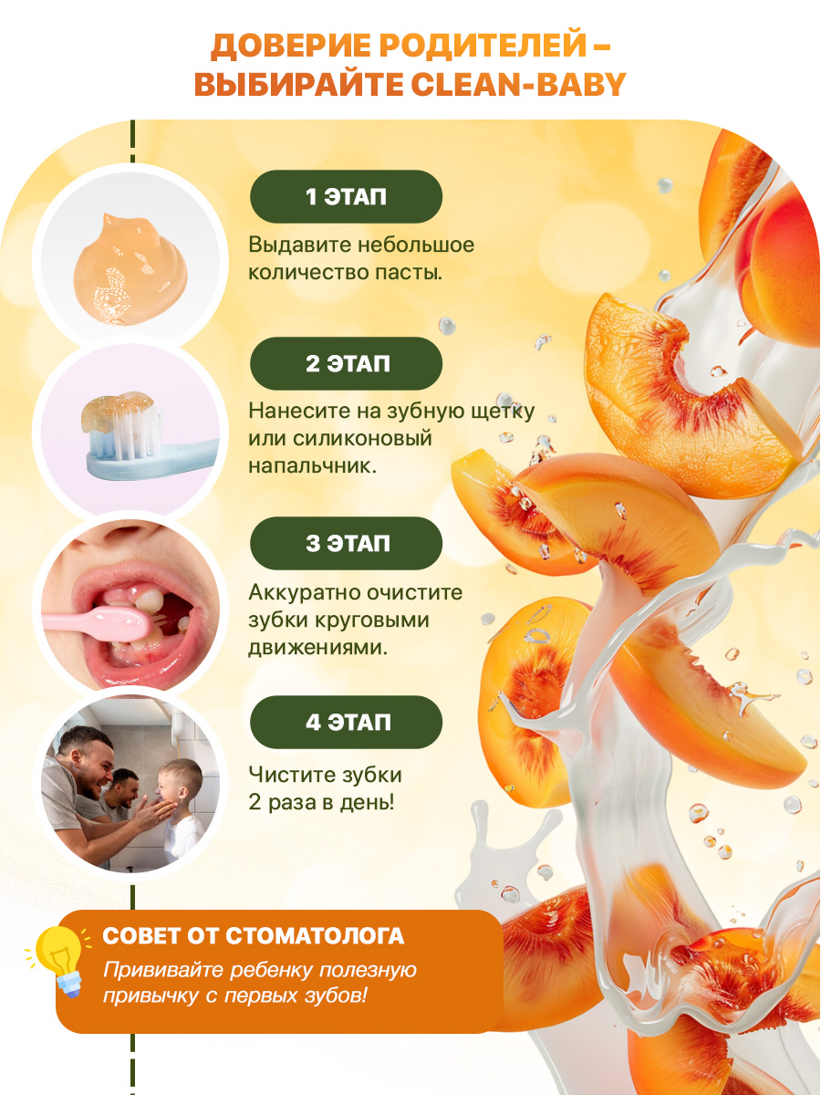 Безопасный уход за первыми зубами с первого дня жизни! Набор из двух детских зубных паст Clean-baby (Персик) создан специально для малышей от 0 до 2 лет. Благодаря натуральному составу и мягкой формуле, процесс чистки становится приятным ритуалом, а не стрессом для ребенка и родителей.