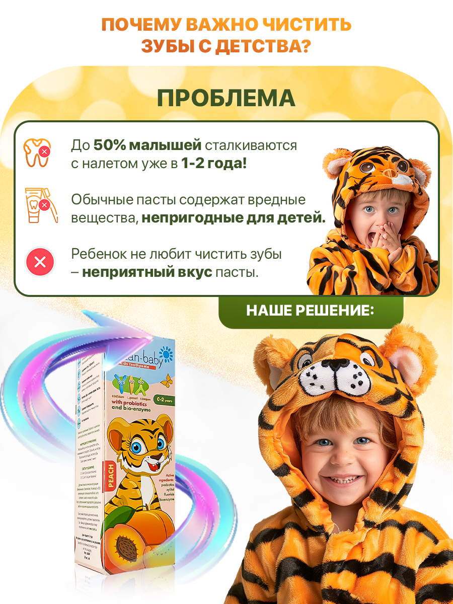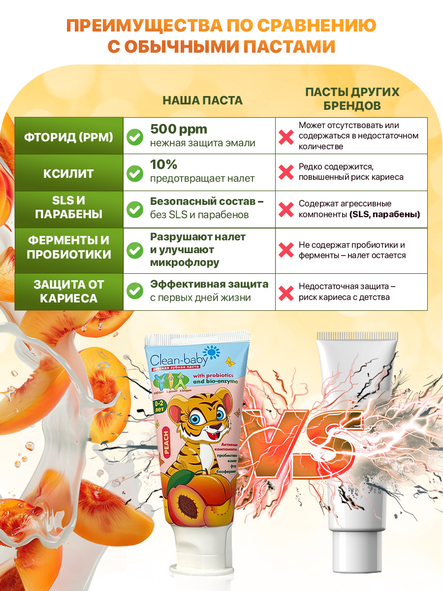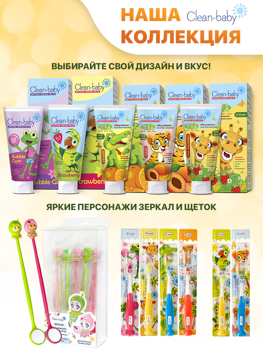 Безопасный уход за первыми зубами с первого дня жизни! Набор из двух детских зубных паст Clean-baby (Персик) создан специально для малышей от 0 до 2 лет. Благодаря натуральному составу и мягкой формуле, процесс чистки становится приятным ритуалом, а не стрессом для ребенка и родителей.
