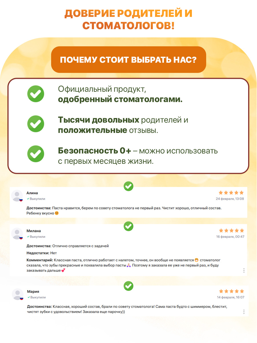 Паста предназначена для ежедневной гигиены полости рта с момента появления первого зубика. Рекомендуется использовать дважды в день — утром и перед сном.