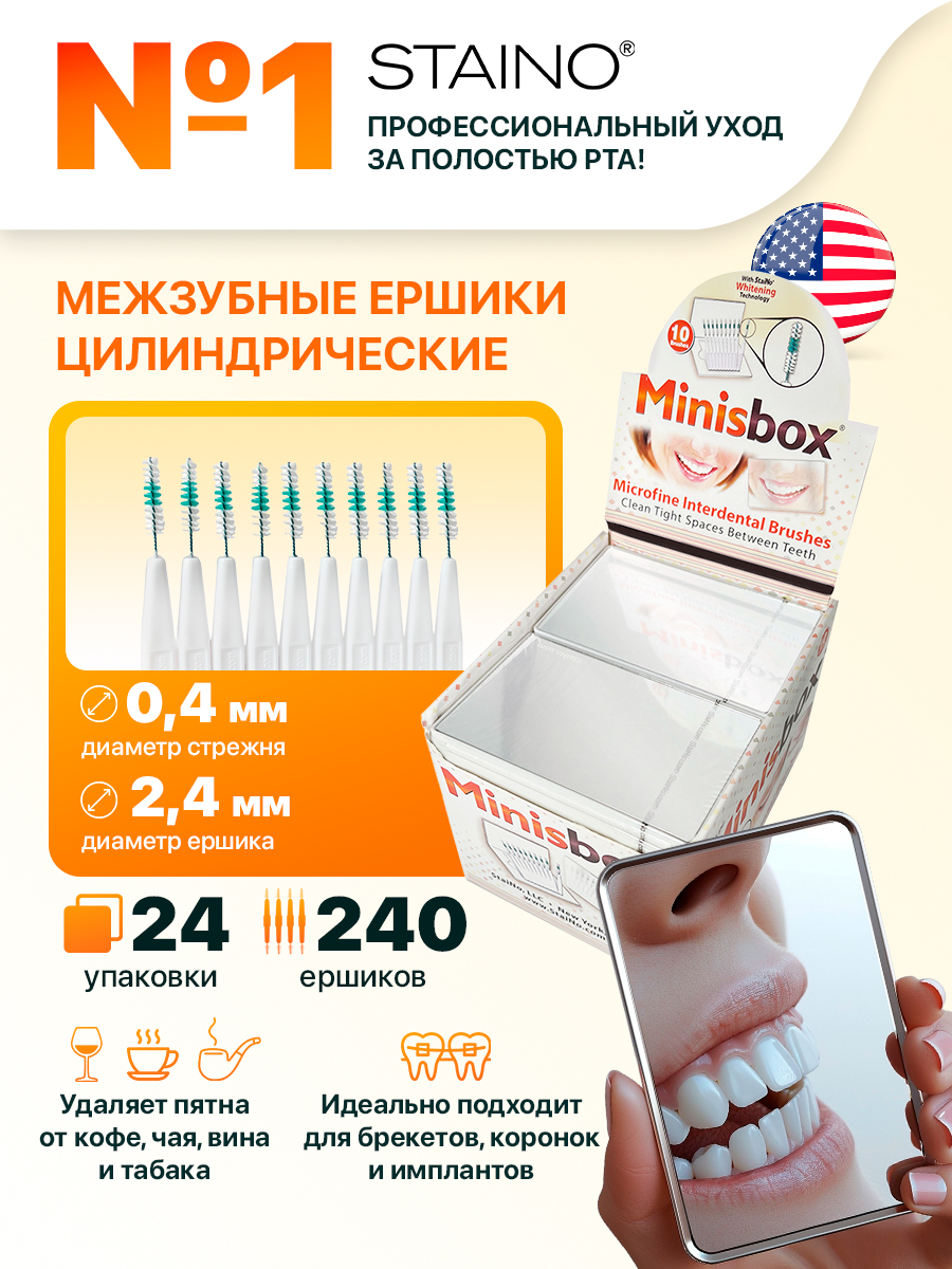 STAINO Minisbox – Межзубные цилиндрические ершики с зеркалом, (240 шт.), размер 0,4 мм, S5664