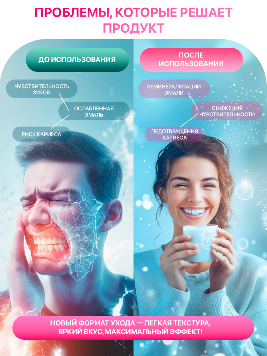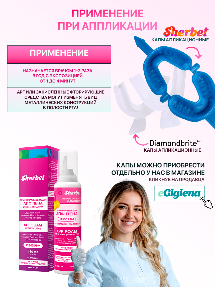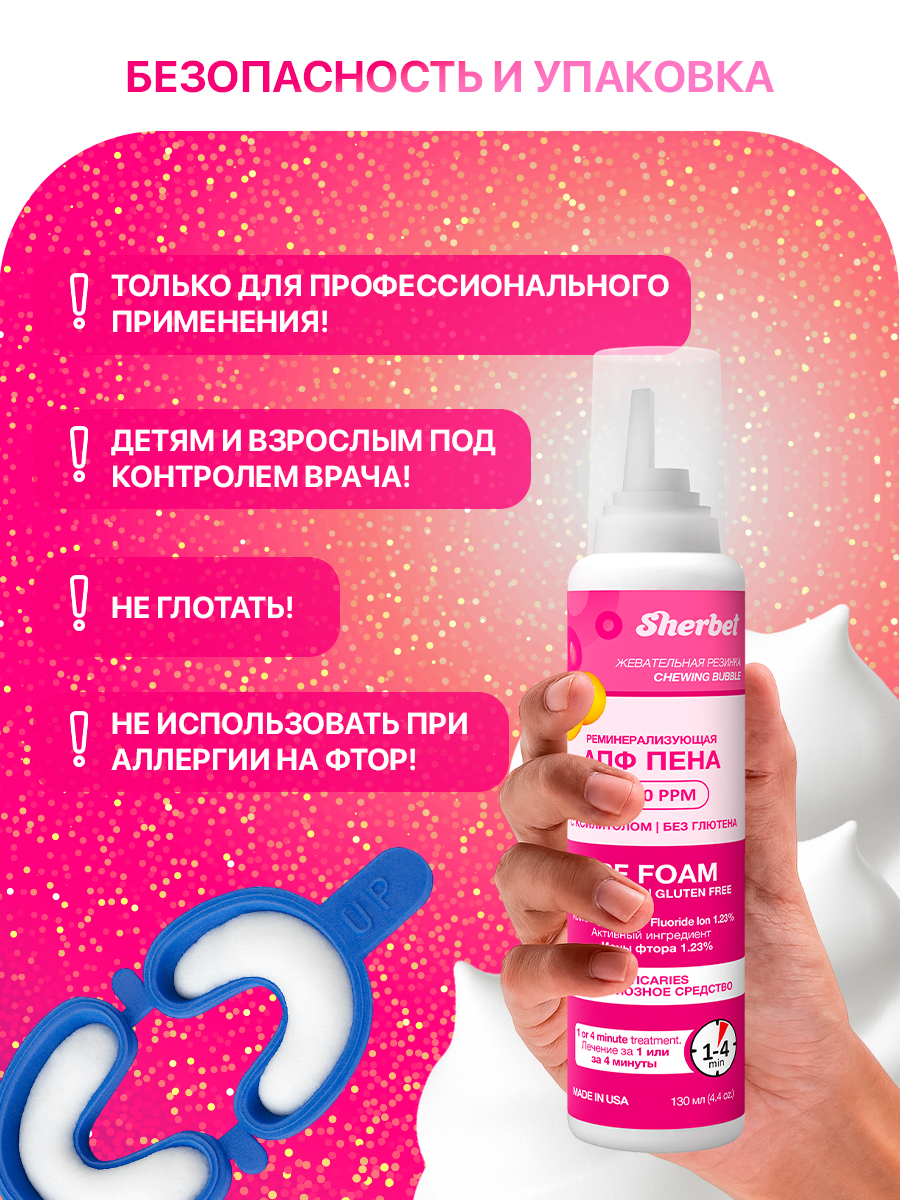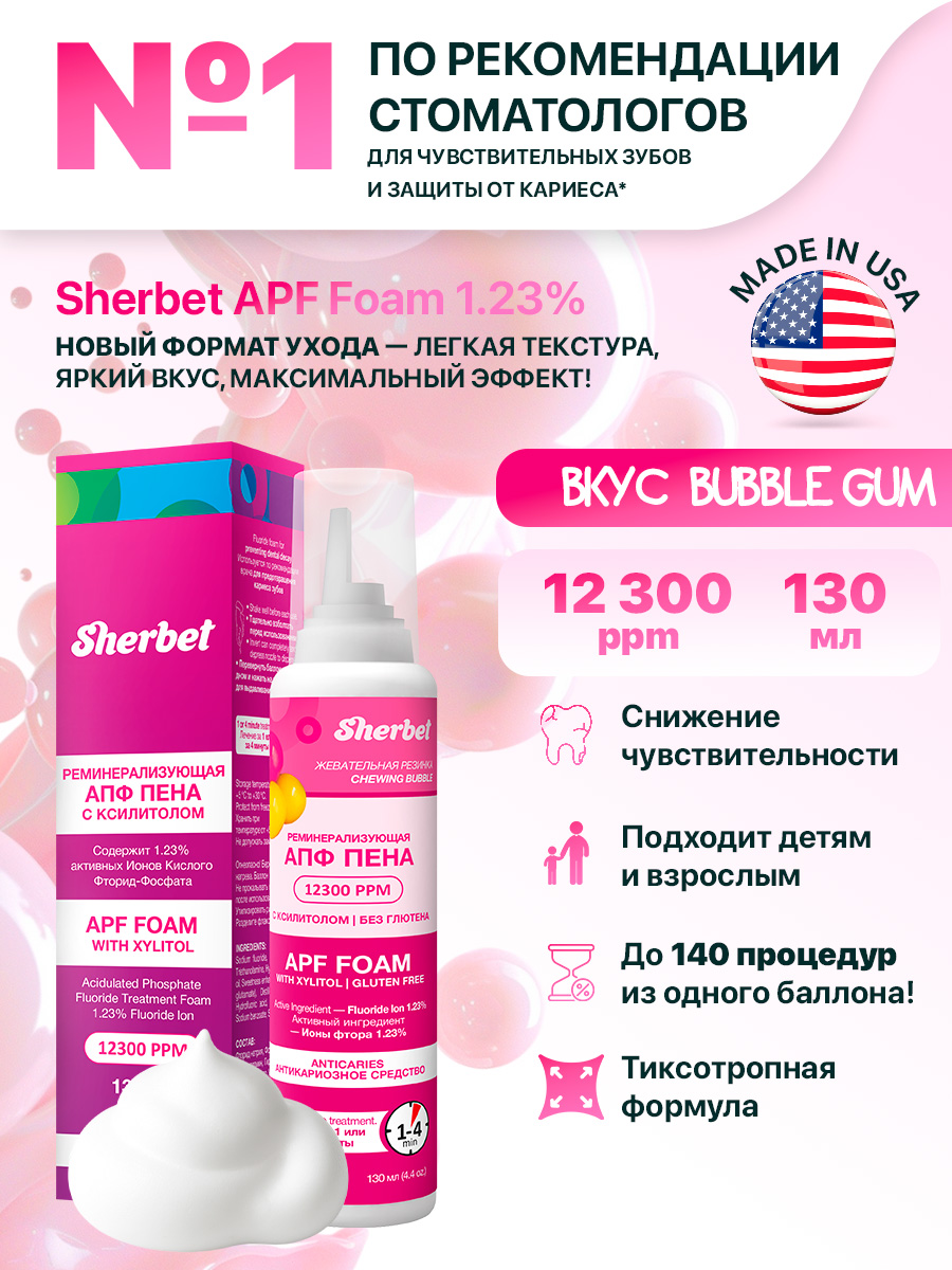 Инновационный уход за эмалью в формате воздушной пены! Реминерализирующая АПФ пена SHERBET со вкусом любимой жевательной резинки — это профессиональное средство для укрепления зубов, которое работает там, где обычная паста бессильна. Благодаря уникальной формуле с аморфным фосфатом кальция (АПФ), продукт мгновенно насыщает эмаль минералами, снижает чувствительность и возвращает зубам природный блеск.