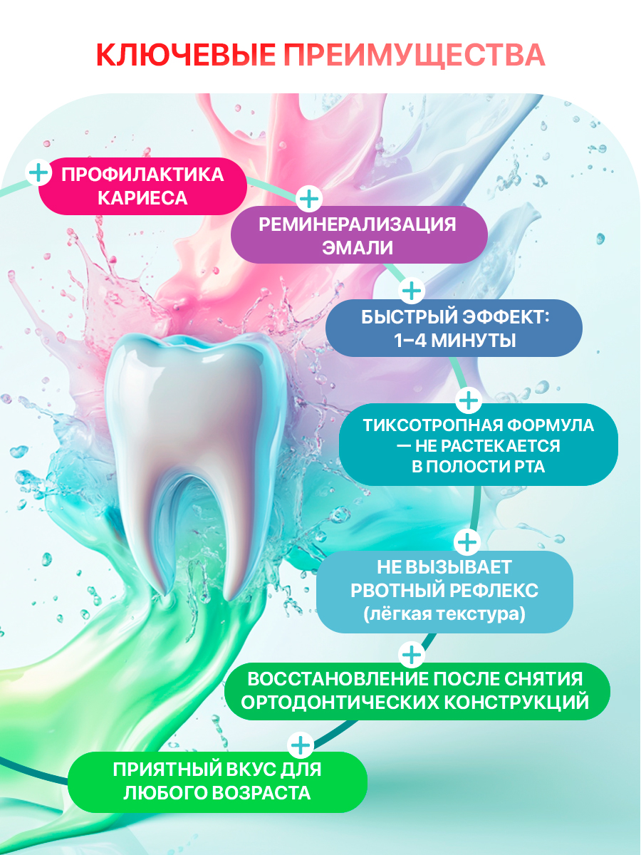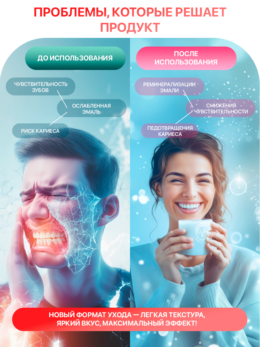 Продукт предназначен для укрепления эмали и гигиены. Данное средство не является отбеливающими полосками, зубным порошком или гелем для фиксации протезов. Не заменяет полноценную чистку зубов щеткой, а служит мощным дополняющим этапом для сохранения здоровья ваших зубов.