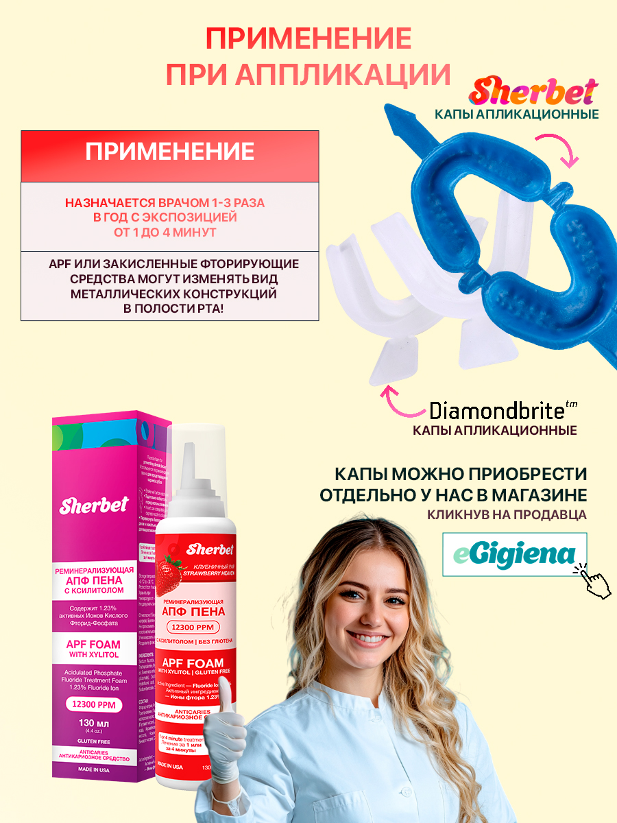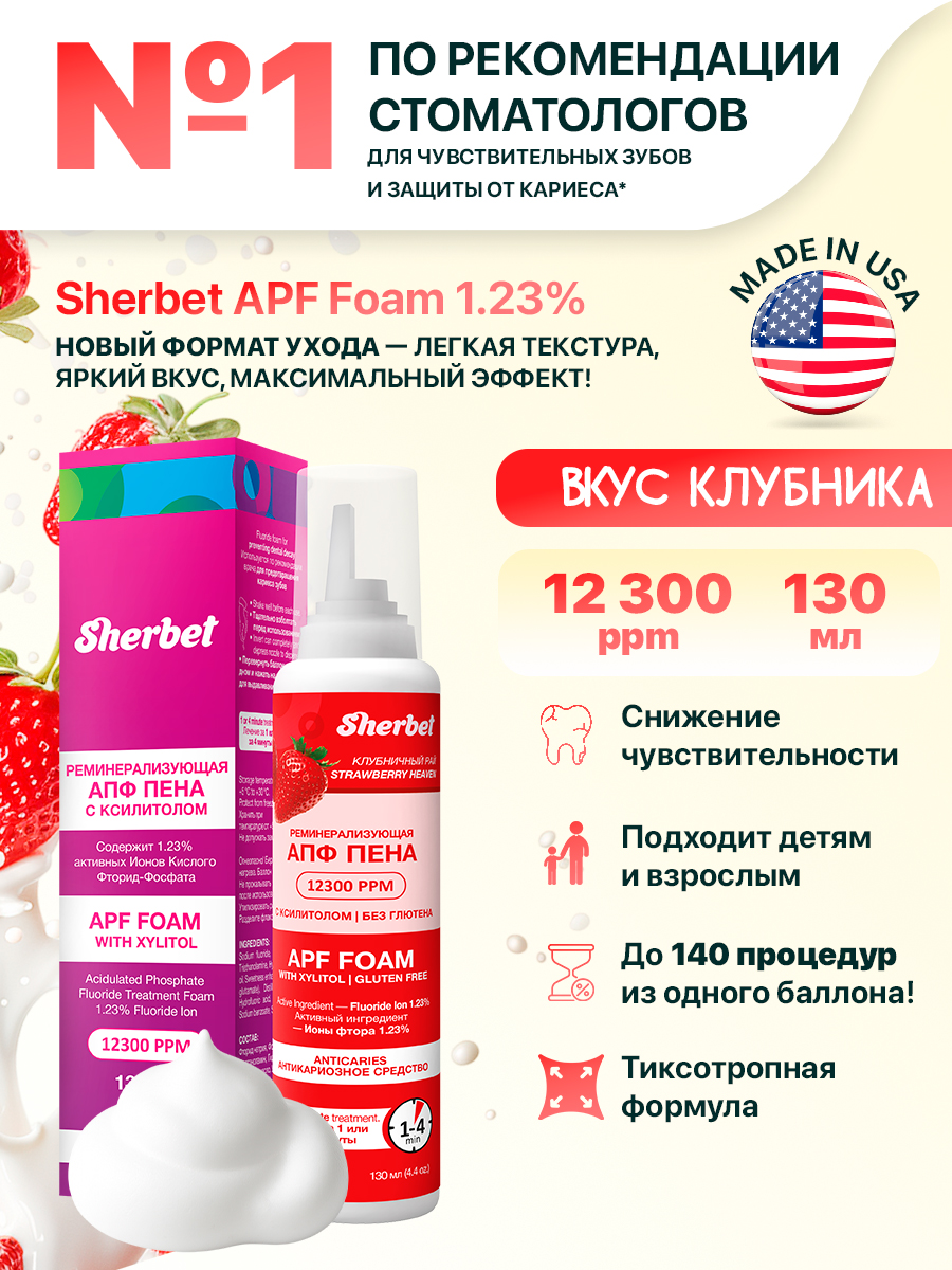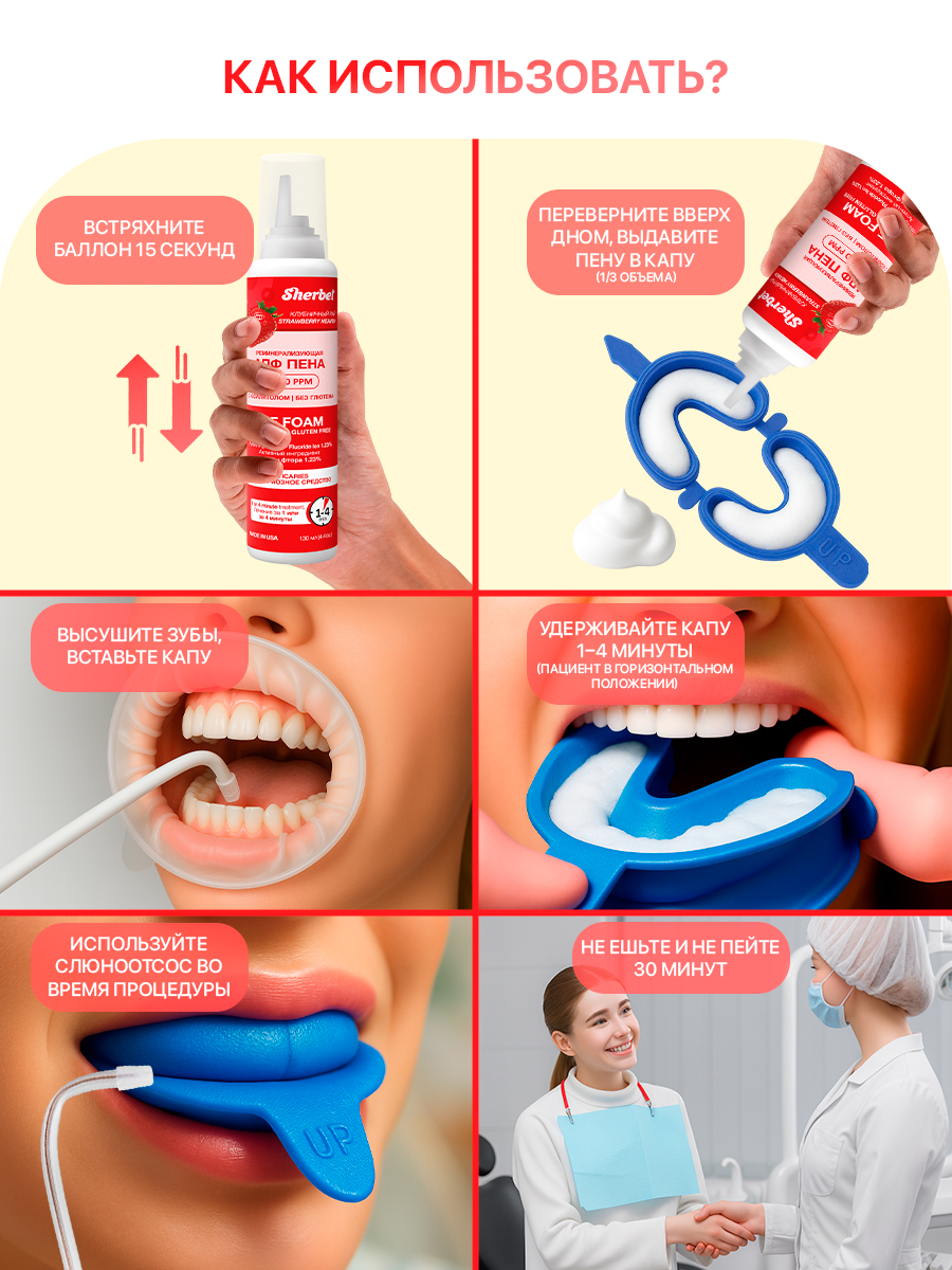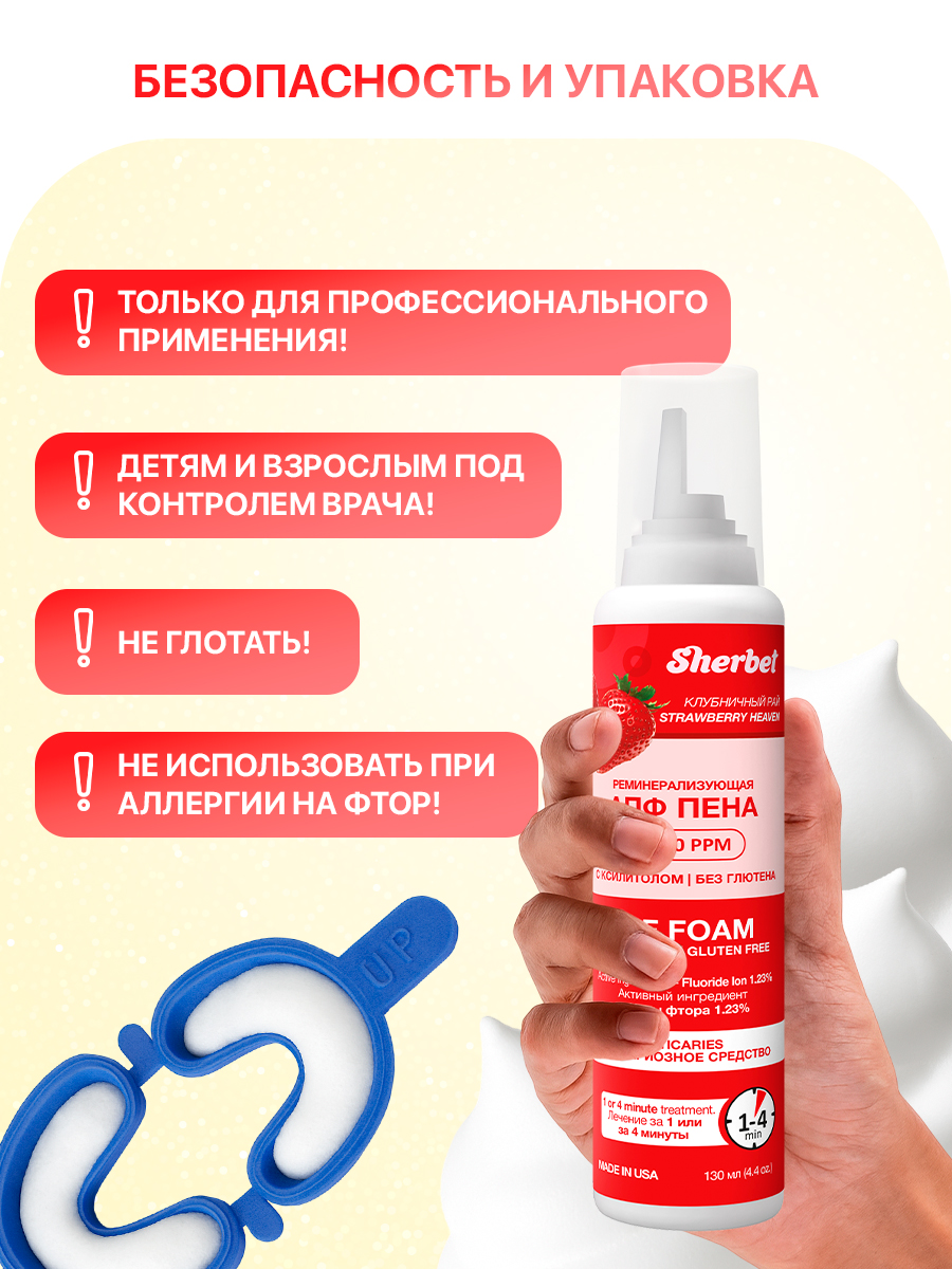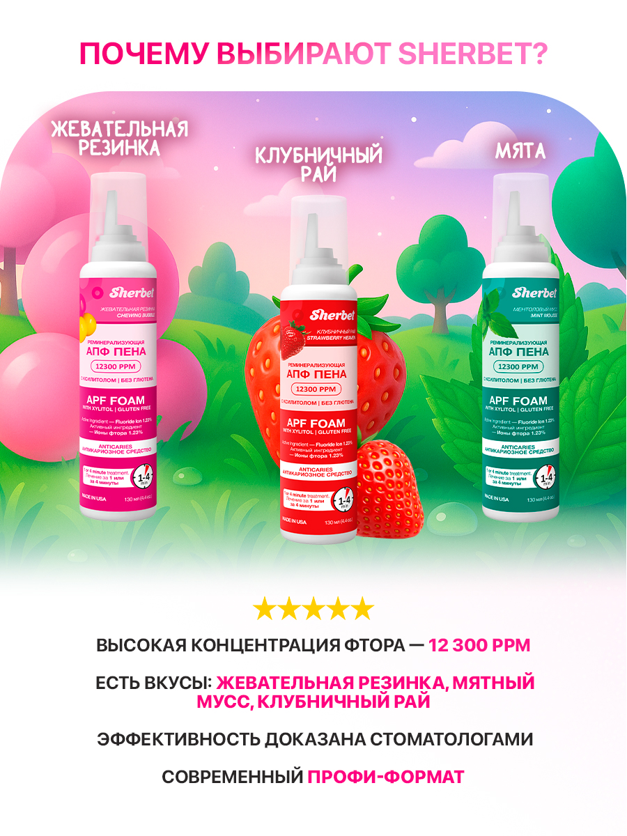 Улыбка как искусство — профессиональный уход у вас дома! Реминерализирующая АПФ пена SHERBET (Шербет) — это инновационный продукт для глубокого восстановления эмали и профилактики кариеса. Благодаря уникальной формуле с аморфным фосфатом кальция, активные компоненты проникают в структуру зуба в разы быстрее традиционных паст, обеспечивая мгновенное снижение чувствительности и возвращая зубам природный блеск.
