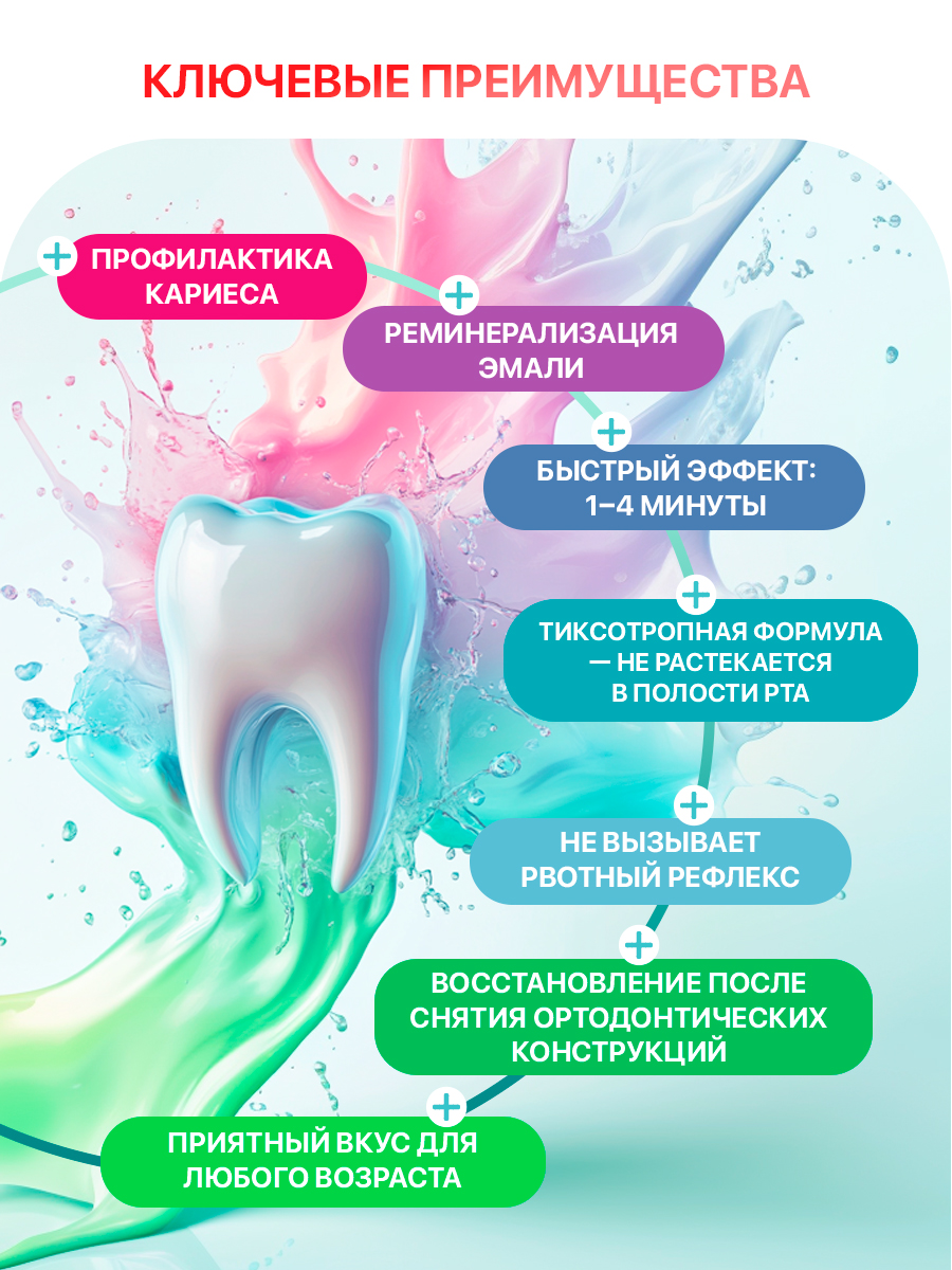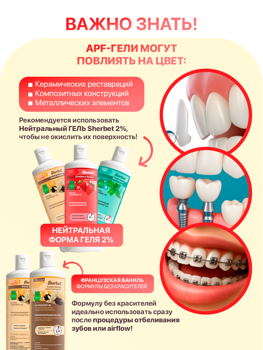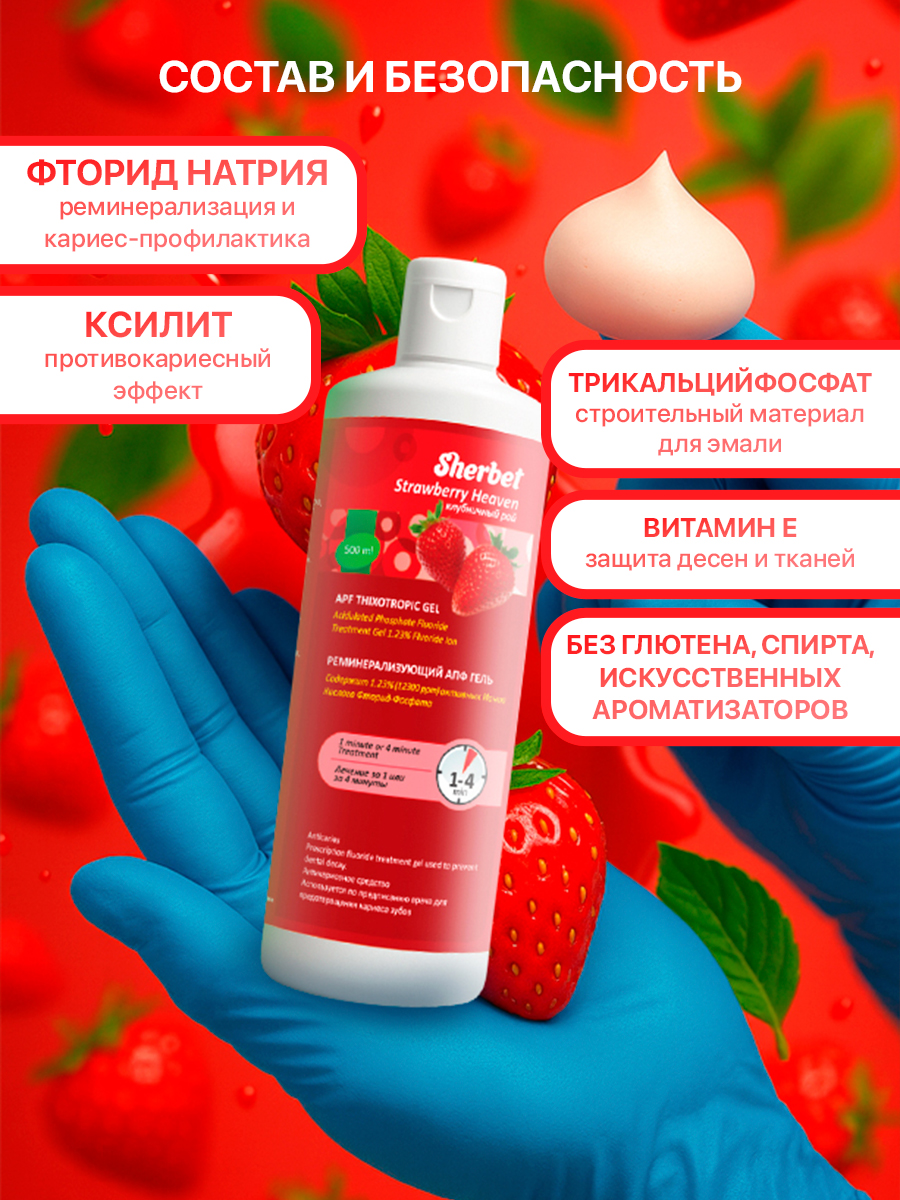 Продукт особенно рекомендован для людей, находящихся в группе риска заболевания кариесом, а также в ситуациях с недостаточным контролем за гигиеной полости рта. Также АПФ-гель прекрасно подходит в качестве реминерализующей терапии после ортодонтического лечения. АПФ-составы чрезвычайно эффективны за счет закисленности, ионы фтора действуют быстрее и проникают глубже, запечатывая дентинные канальцы и снижая проницаемость эмали для раздражителей и патогенных микроорганизмов, вызывающих образование кариеса. Обладает свойством тиксотропности – предотвращает затекание материала в гортань пациента. Sherbet уникален благодаря содержанию ксилита, который снижает адгезию бактерий к поверхности зуба, содержанию витамина Е, обеспечивающего эффект антиоксиданта и десенсибилизатора, а также не содержит спирты, глютен, соевое молоко, яйца, лесные и земляные орехи! Все ароматизаторы в нашей продукции только натурального происхождения.