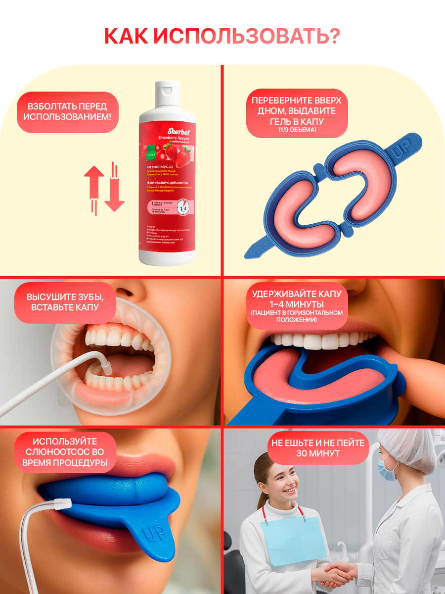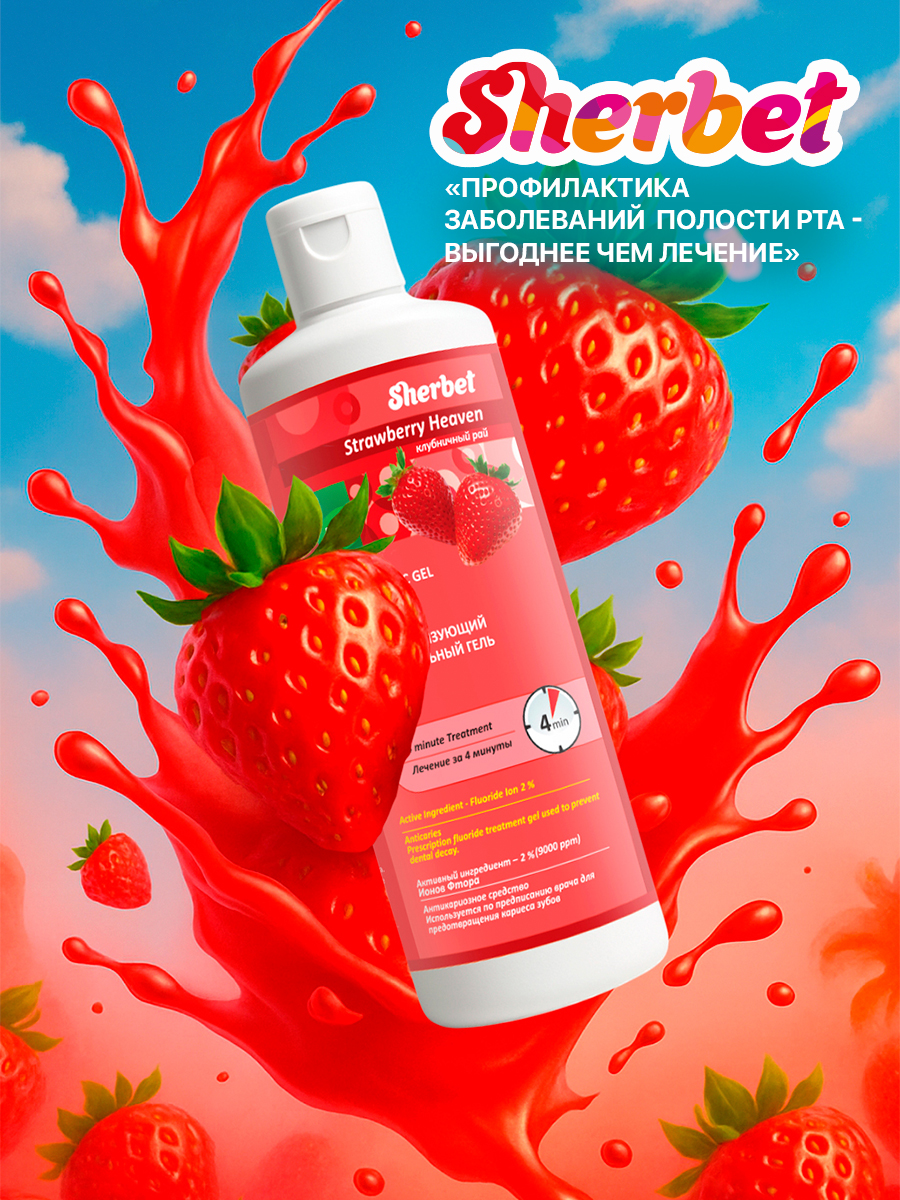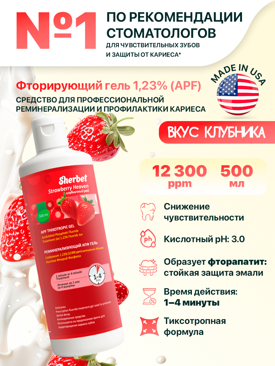 Гель Sherbet APF с клубничным вкусом обычно используется на стоматологическом приеме для предотвращения заболевания кариесом и для снижения чувствительности зубов на температурные (холод, тепло) и химические раздражители (кислое, сладкое). Содержание ионов фторида - 1.23%(12 300ppm) с показателем pH 3.0.