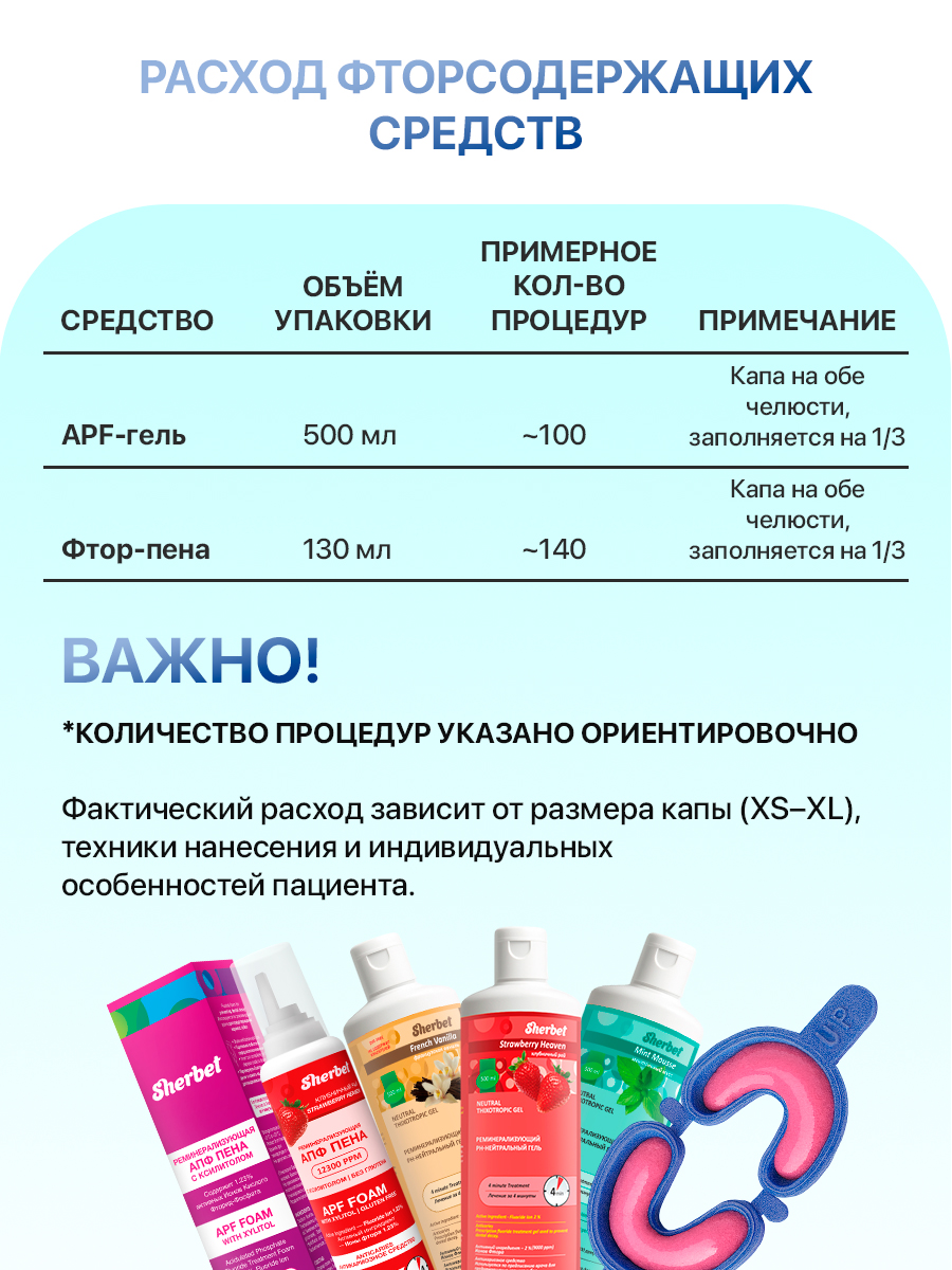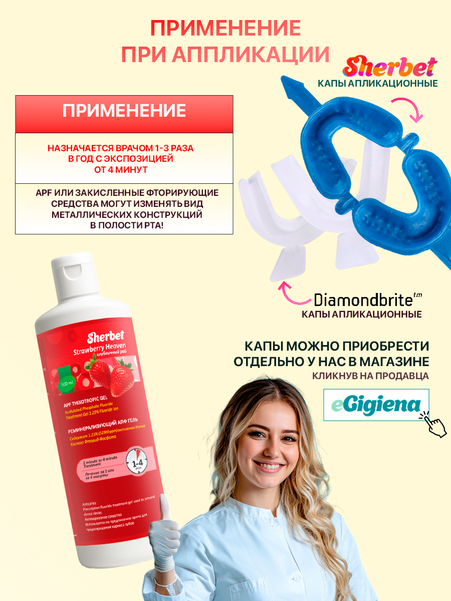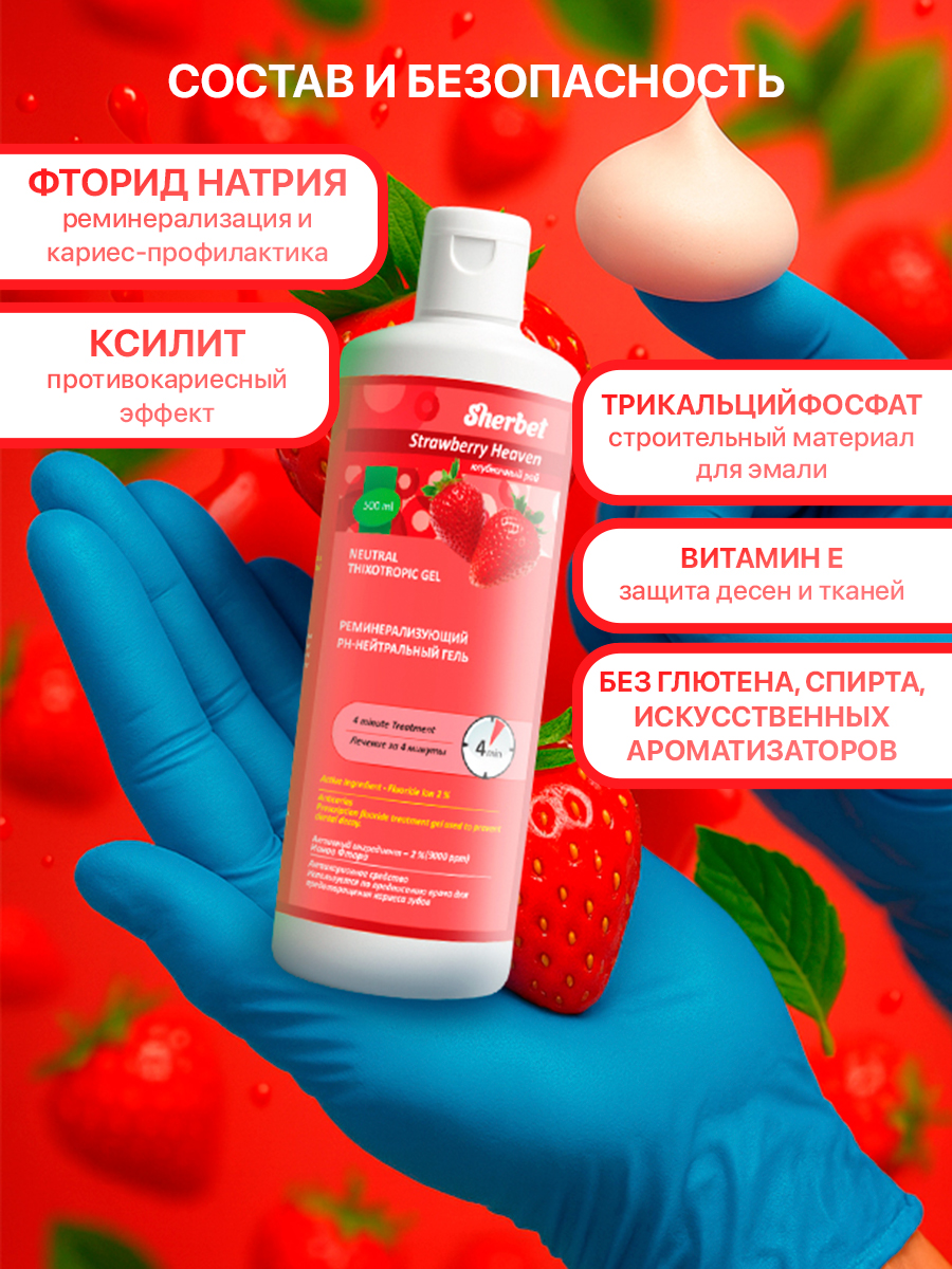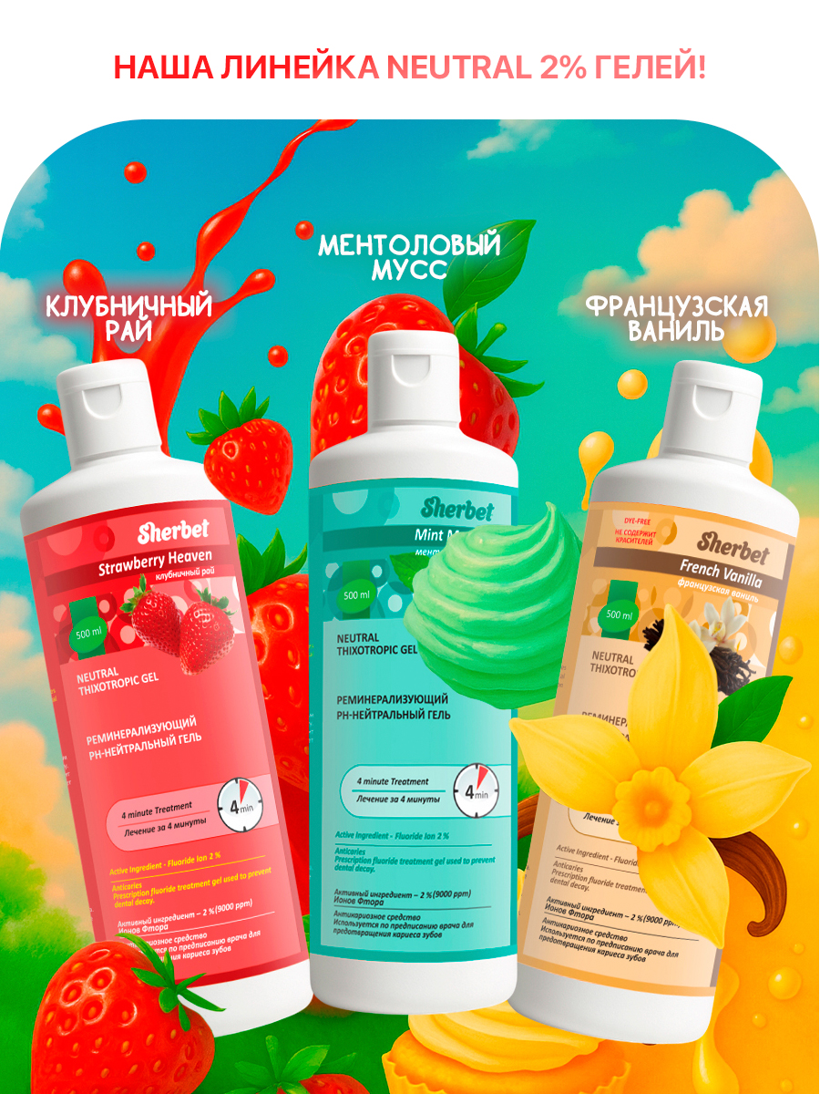 Обладает свойством тиксотропности – предотвращает затекание материала в гортань. Sherbet уникален благодаря содержанию ксилита, который снижает адгезию бактерий к поверхности зуба, содержанию витамина Е, обеспечивающего эффект антиоксиданта и десенсибилизатора, а также не содержит алкоголь, глютен, соевое молоко, яйца, лесные, земляные орехи! Все ароматизаторы в нашей продукции только натурального происхождения!