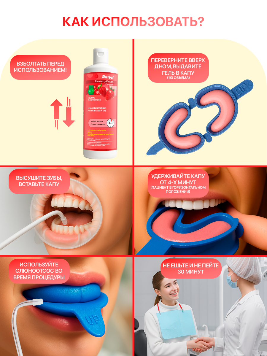 Только для профессионального применения! Взболтайте перед использованием. Для лучшего результата рекомендуется повторять процедуру дважды в год — независимо от частоты прочих сеансов профессиональной гигиены! Наполните две одиночных или одну двойную ложку средством на 1/3. Просушите воздухом поверхность зубов, введите ложки в полость рта. Далее необходимо слегка прикусить ложки, удерживая их так в течение 1 минуты (80% эффективности) или 4 минут (100% эффективности). После удалить ложки, сплюнуть остатки со слюной. Не есть как минимум 30 минут. Можно использовать детям старше 6 лет.