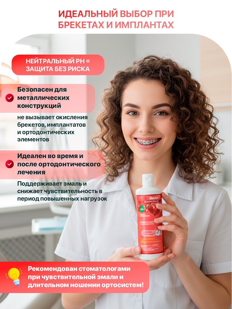 рН-нейтральный гель с клубничным вкусом используется профессионалами на стоматологическом приеме, предотвращает заболевание кариесом, снижает чувствительность зубов на температурные (холод, тепло) и химические раздражители (кислое, сладкое). Гель особенно рекомендован людям, находящимся в группе риска заболевания кариесом, а также в ситуациях с недостаточным контролем гигиены полости рта. Также средство прекрасно подходит в качестве реминерализующей терапии во время ортодонтического лечения. Содержание 2%(9 000ppm) ионов фтора с показателем pH 7. Рекомендовано применять у пациентов имеющих брекеты, метал- локерамические конструкции в полости рта или при реставрации фронтальной группы зубов. Считается, что подкислен- ный гель (APF) может вызвать коррозию металла и снять блеск с реставраций.