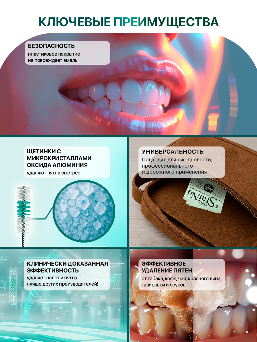 - Технология STAINO®: микрокристаллы оксида алюминия эффективно удаляют налет и пигментированные пятна от кофе, табака и вина.