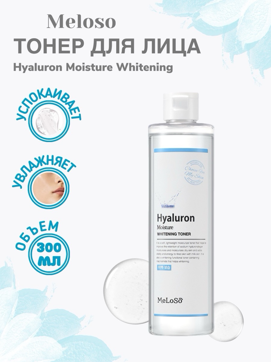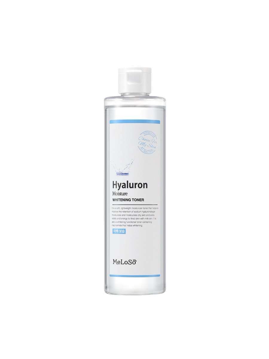 Meloso Toner Hyaluron Moisture Whitening — это лёгкий тонер для лица объёмом 300 мл, созданный для глубокого увлажнения и выравнивания тона кожи. Он содержит гиалуроновую кислоту, которая притягивает и удерживает влагу в клетках, укрепляя барьерный слой кожи и придавая ощущение комфортной мягкости.