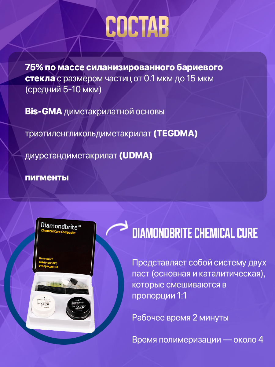 Материал Diamondbrite Chemical Cure представляет собой систему двух паст (основная и каталитическая), которые смешиваются 1 к 1. Рабочее время 1 минута 40 секунд. Время полимеризации — около 4 минут.