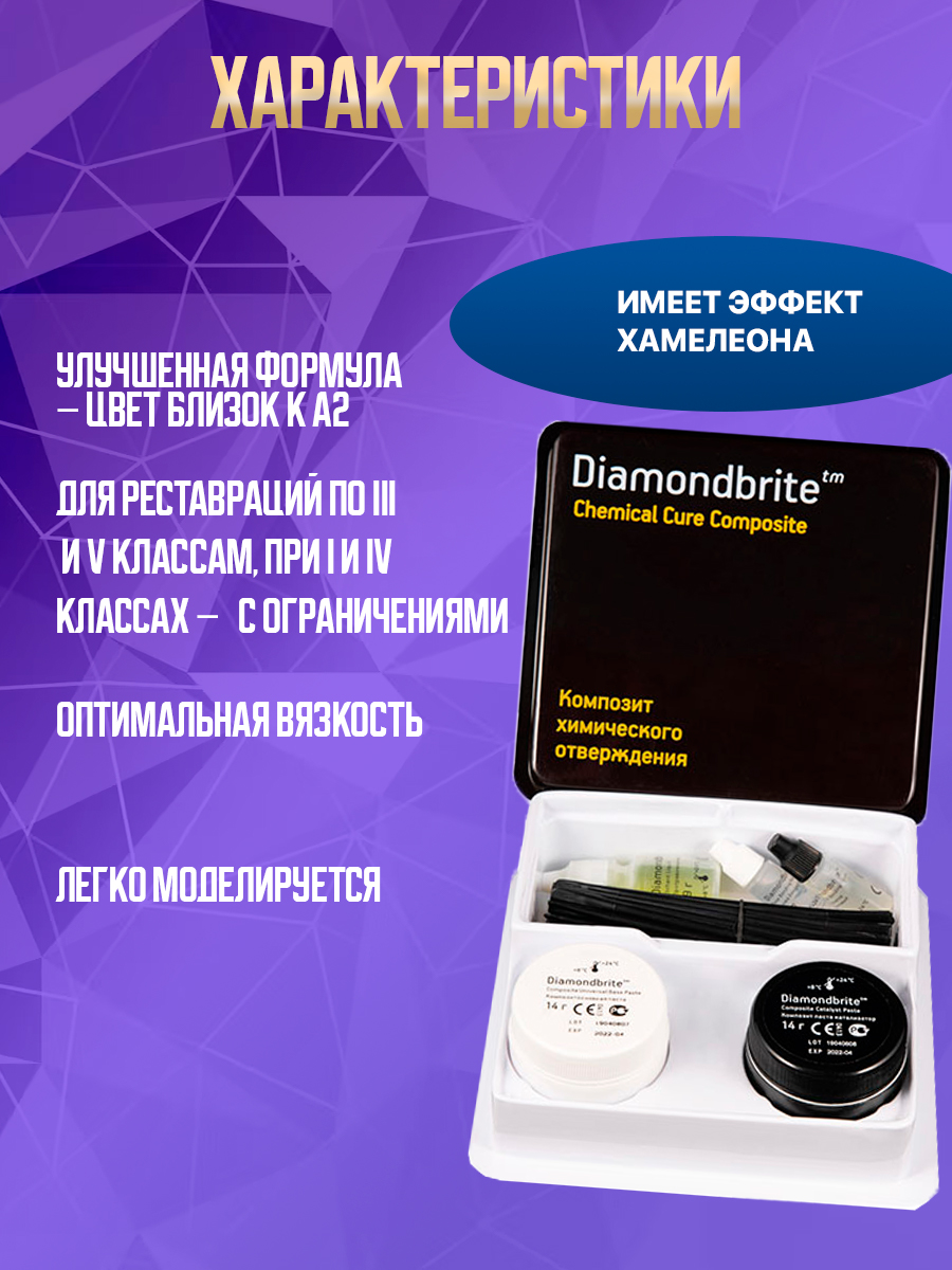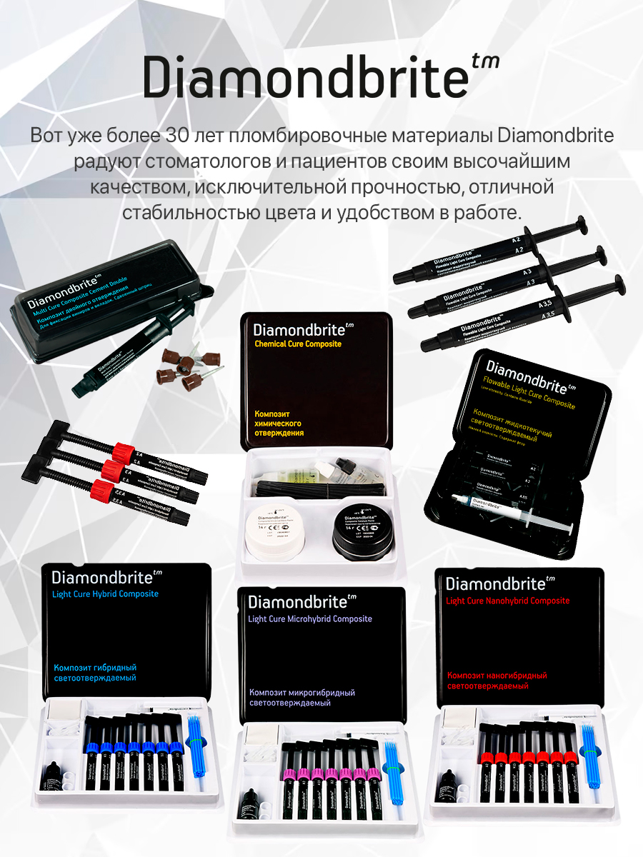 Набор гибридного композитного пломбировочного материала химического отверждения Diamondbrite Chemical Cure с эффектом хамелеона используется для проведения реставраций по III и V классам, на полостях I и и небольших полостях IV — с ограничениями.