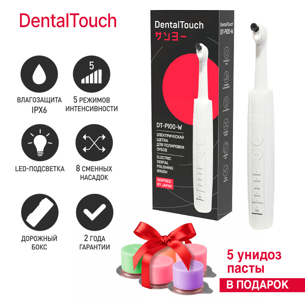 Электрический аппарат для полировки зубов DentalTouch — это профессиональный уход за полостью рта в компактном формате. Набор включает в себя мощный полишер и ПОДАРОК: 5 унидоз профессиональной полировочной пасты Sherbet, которая используется стоматологами для эффективного и бережного очищения эмали.