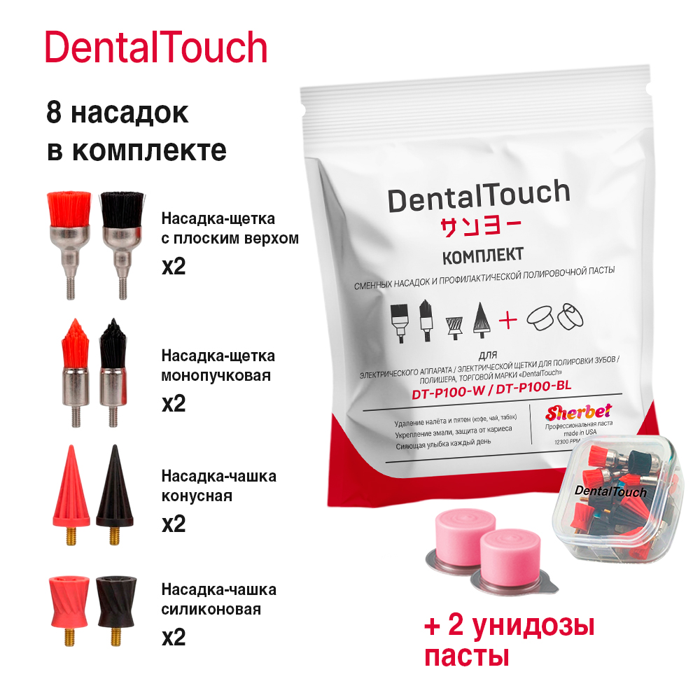 DentalTouch — комплект сменных насадок и профессиональной полировочной пасты для ухода за зубами в домашних условиях. Набор предназначен для использования с электрическими аппаратами DentalTouch DT-P100-W и DT-P100-BL и помогает поддерживать чистоту, гладкость и эстетичный внешний вид зубной эмали между визитами к стоматологу.