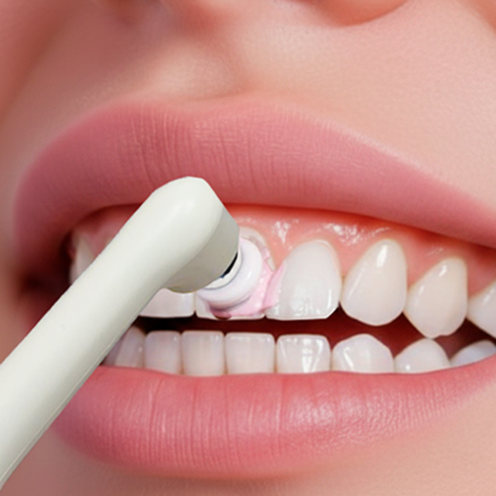 Включите прибор и выполняйте полировку лёгкими круговыми движениями без давления, обрабатывая внешнюю, внутреннюю и жевательную поверхности зубов. Для межзубных промежутков используйте заострённые или конические насадки.