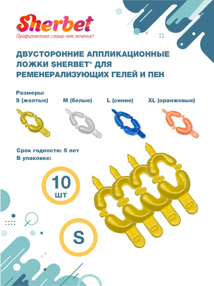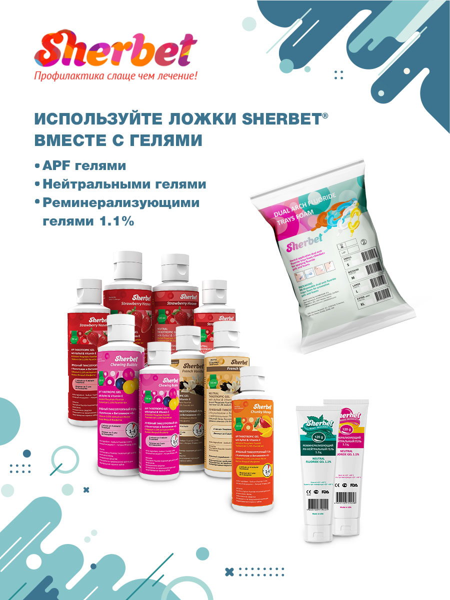 Двойные аппликационные капы Sherbet предназначены для аппликации реминерализирующих (фтор- и кальций-содержащих) гелей как в кресле стоматолога, так и в домашних условиях.