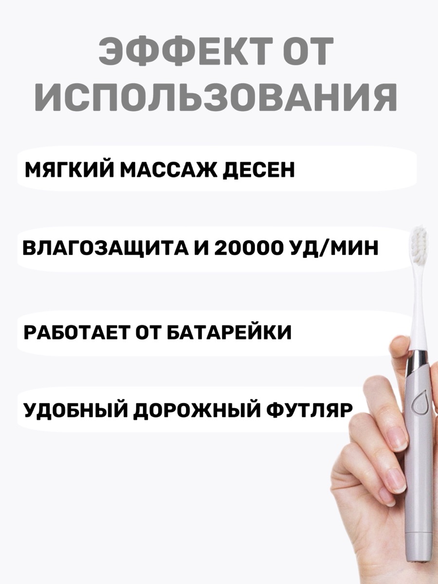 Компактные размеры щетки позволяют брать её с собой в поездки и путешествия. Работает от батарейки типа ААА (мизинчиковая) и не требует подключения к источникам питания. Благодаря дорожному футляру щетка всегда будет в чистоте.